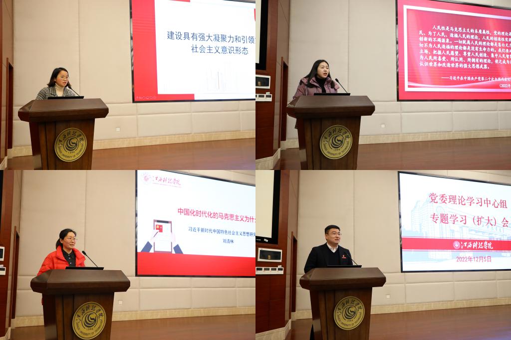 宣讲结束后,校党委委员、宣传部部部长郭月芳,马克思主义学院副院长王玲玲,习近平新时代中国特色社会主义思想研究中心科研教师刘清林,信息工程学院党委书记、学工副院长林赛华聚焦党的二十大报告的主题主线、热点焦点、创新要点和学习体会,分别作交流发言。