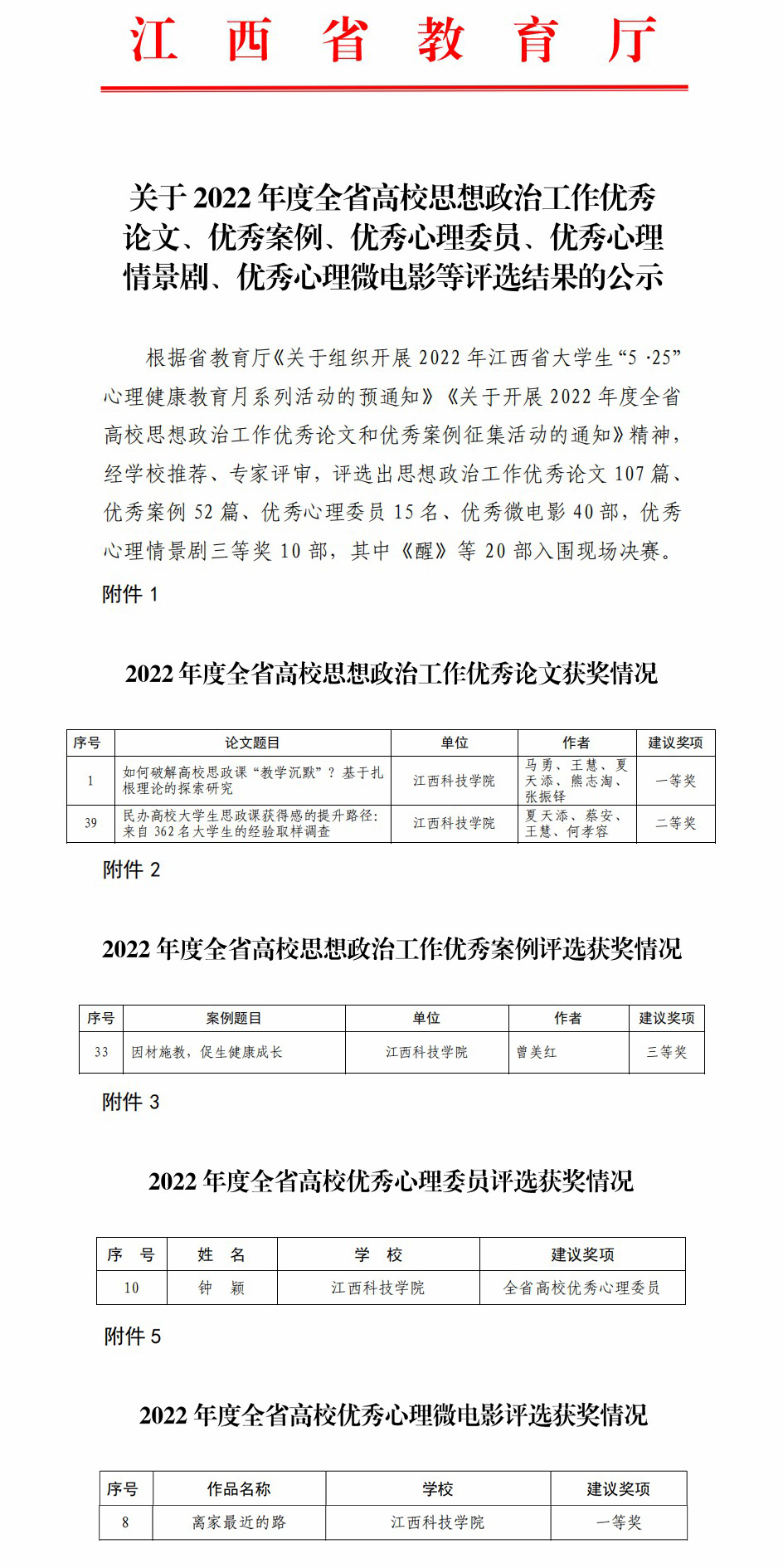 其中,马勇、王慧、夏天添、熊志淘、张振铎撰写的《如何破解高校思政课“教学沉默”?基于扎根理论的探索研究》和夏天添、蔡安、王慧、何孝容撰写的《民办高校大学生思政课获得感的提升路径:来自362名大学生的经验取样调查》分别荣获2022年度全省高校思想政治工作优秀论文一等奖、二等奖。由曾美红结合实际工作经历撰写的《因材施教,促生健康成长》工作案例荣获2022年度全省高校思想政治工作优秀案例三等奖。财经学院19本国际经济与贸易2班钟颖获选全省高校优秀心理委员。文化与传媒学院选送的微电影《离家最近的路》(指导老师:蒋尚成,主创人员:陈琪琳、洪佳雨、刘湘鹏、毛潇溱)荣获2022年度全省高校优秀心理微电影一等奖。