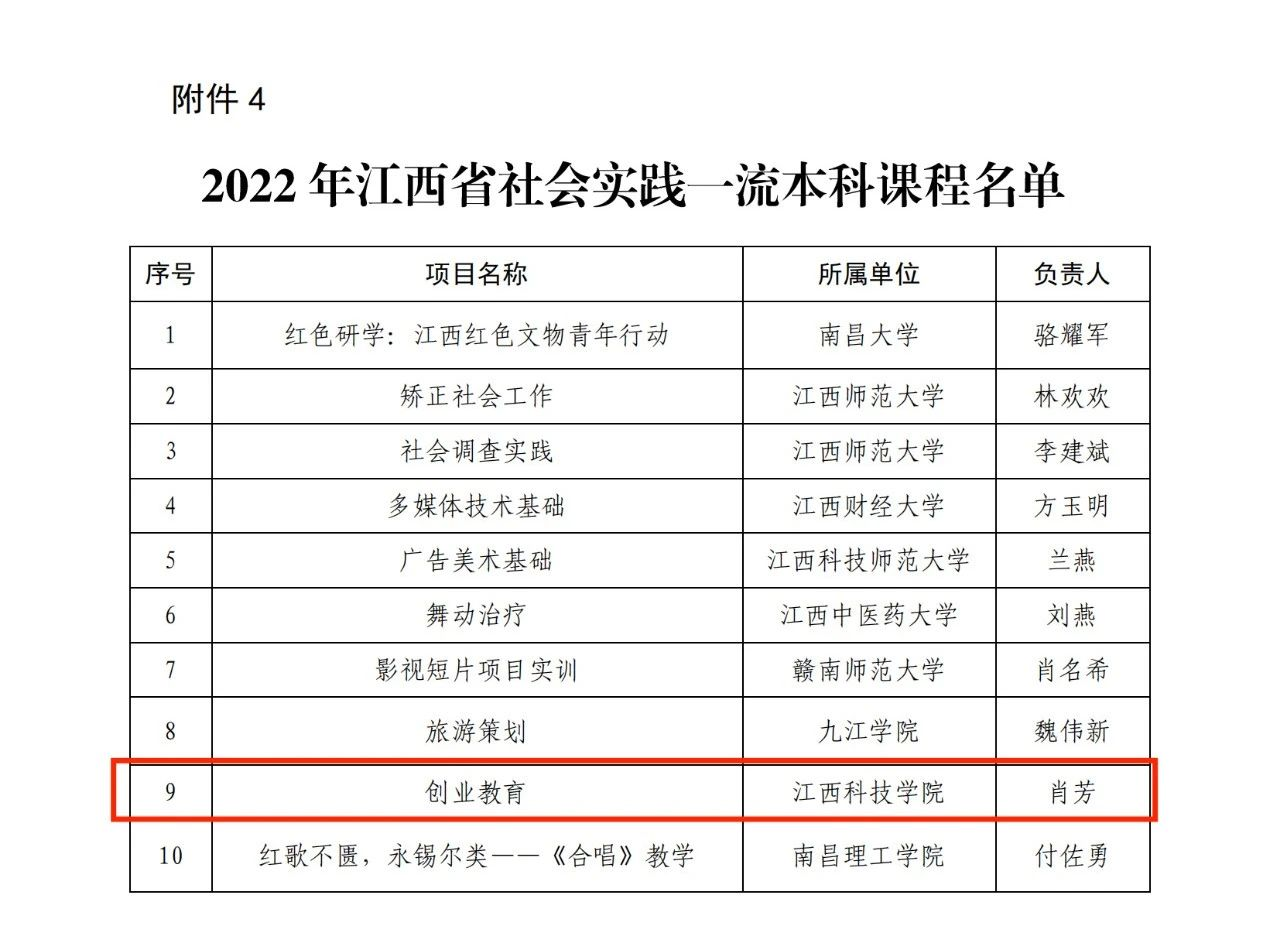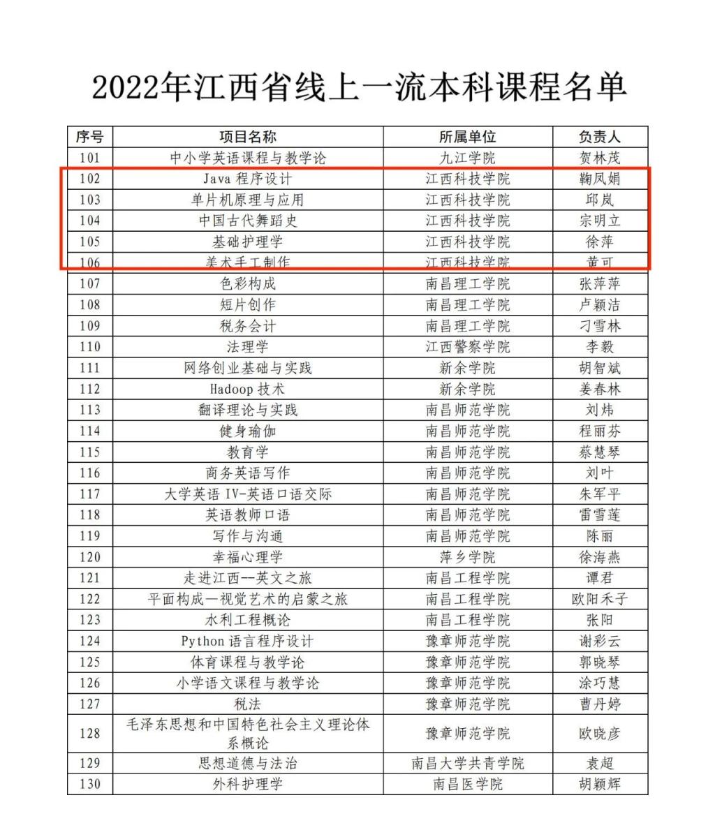 江科网讯(教务处)近日,江西省教育厅公布了2022年江西省线上、线下、线上线下混合式、社会实践一流本科课程认定结果,我校《Java程序设计》等7门课程获批认定。其中,线上一流本科课程5门,线上线下混合式一流本科课程1门,社会实践一流本科课程1门。