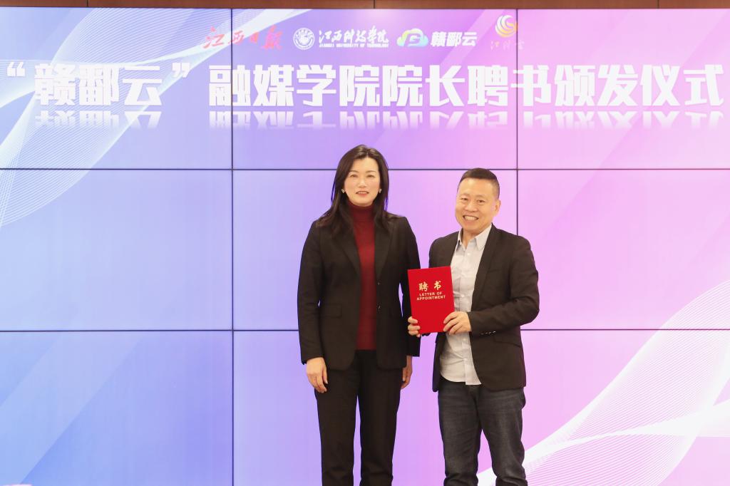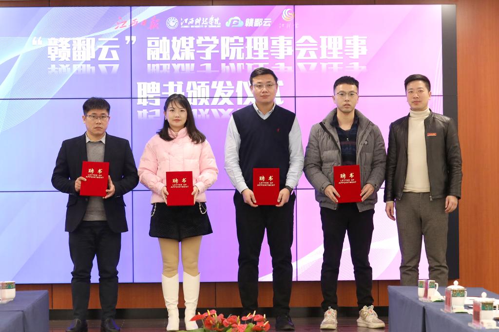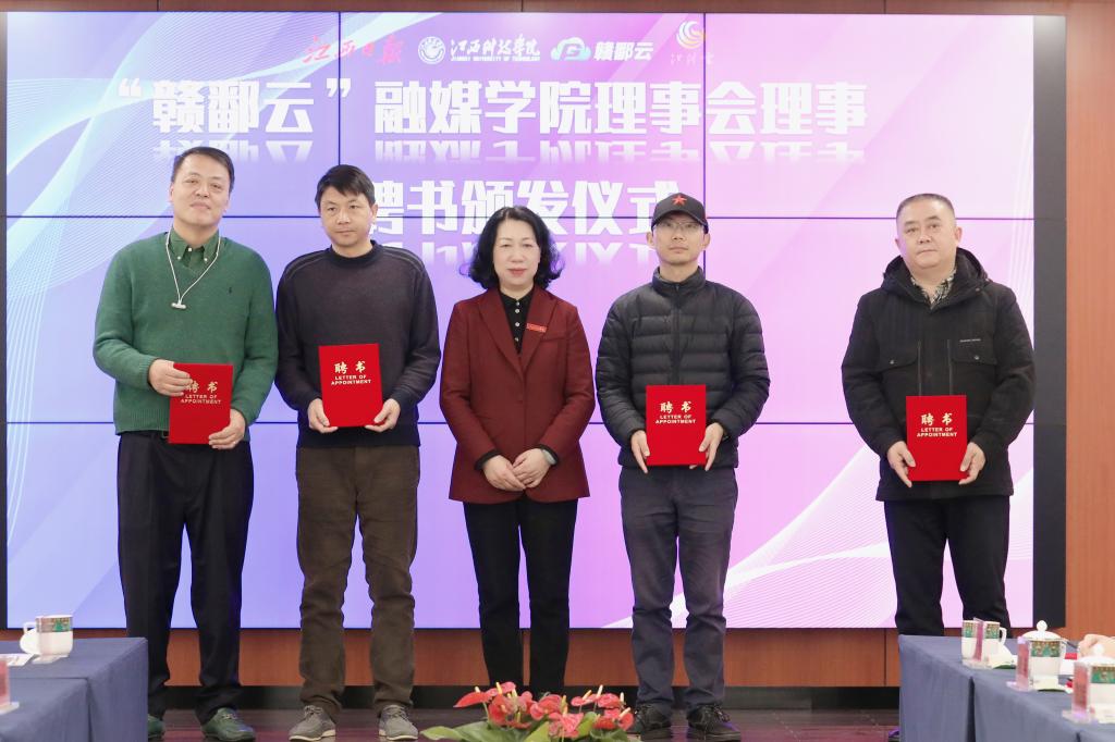江科网讯(记者 何强江)2月10日上午,江西科技学院“赣鄱云”融媒学院院长聘任仪式在行政南三楼会议室举行。校长张海涛颁发聘书,江西新闻客户端总监吴志刚受聘担任“赣鄱云”融媒学院首任院长、江西日报社新参考文摘总编辑黄颖受聘担任“赣鄱云”融媒学院理事会副理事长。副校长林素君、李玮为受聘担任“赣鄱云”融媒学院理事会成员的江西新闻客户端运营副总监李江川、内容副总监邱虎等人颁发聘书。仪式由文化与传媒学院院长、“赣鄱云”融媒学院执行院长贾翔羽主持。