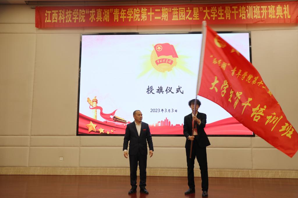 开班仪式上,闵桂林副校长为第十二期“蓝园之星”大学生骨干培训班授旗。