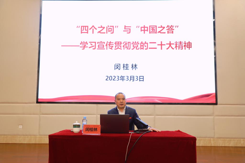 开班仪式后,闵桂林副校长围绕“习近平‘四个之问’命题提出”“习近平‘四个之问’基本诠释”“新时代‘中国之答’基本框架”作专题讲座,为同学们上了一堂生动而深刻的思政课,带领他们学习贯彻党的二十大精神,引导他们坚决拥护党中央决策部署,坚定对未来的信心,激励广大青年以奋斗姿态激扬青春,不负时代,不负华年。他在讲座中深入阐释习近平总书记关于“四个之问”基本内涵和重要意义,并系统梳理习近平总书记关于“中国之答”的重要论述和丰富内涵。他指出,“四个之问”是习近平新时代中国特色社会主义思想的重要组成部分,也是我们面对百年未有之大变局和实现中华民族伟大复兴的科学指南;习近平总书记提出的“中国之答”突出了我国社会主义制度优越性、发展道路正确性、治理能力有效性、文化自信坚定性等方面的显著成就和优势。他强调,我们要坚持以习近平新时代中国特色社会主义思想为指导,深刻认识和把握“四个之问”的时代背景、历史逻辑、理论创新和实践回答,不断增强“四个意识”、坚定“四个自信”、做到“两个维护”,努力为新时代提供“中国之答”。最后,闵桂林副校长结合当前形势和任务,对大骨班同学提出殷切希望和具体要求。他希望大骨班同学牢记初心使命,勤奋学习,在思想政治上坚定信念,在专业知识上精益求精,在创新能力上敢于突破,在社会实践上积极服务,在品德修养上不断提高,在团结协作上互相支持,在爱国奉献上勇担责任,在追求卓越上永不止步。