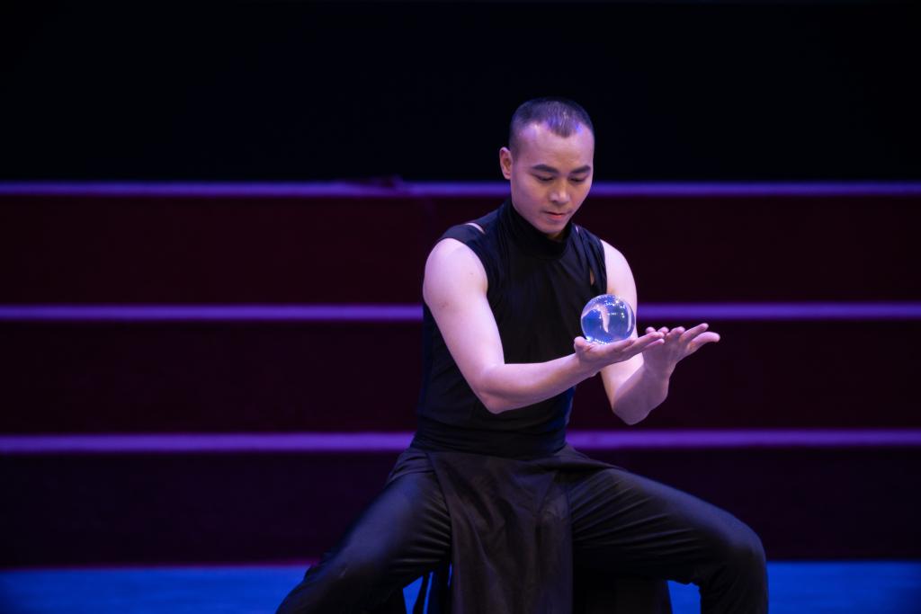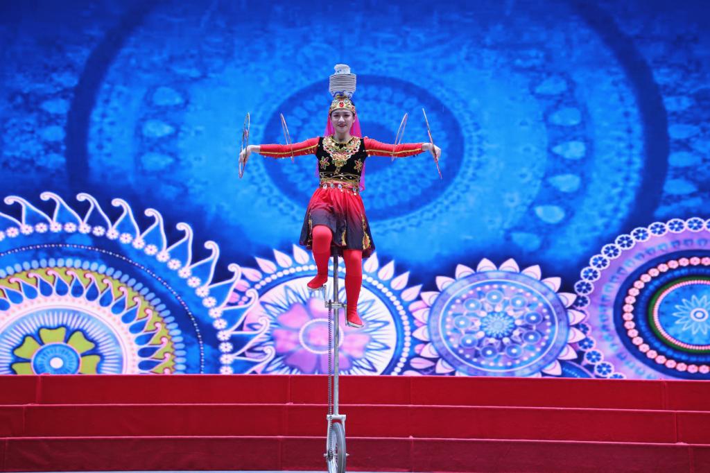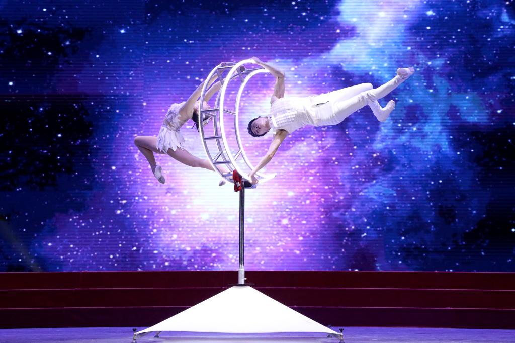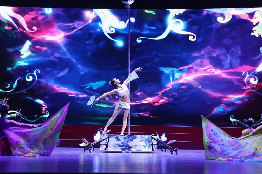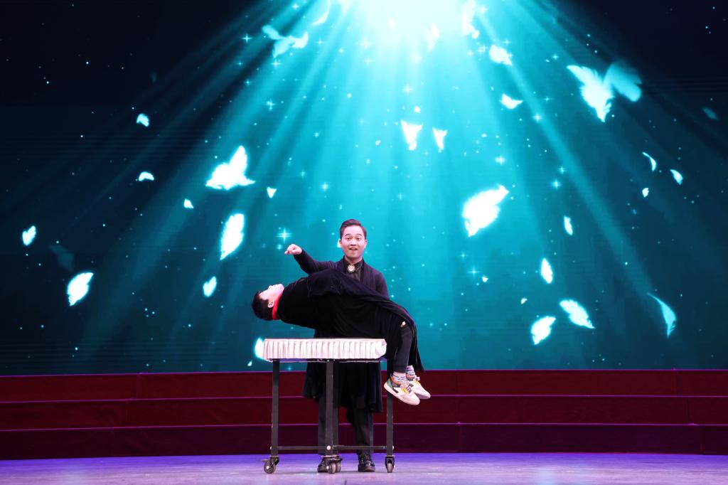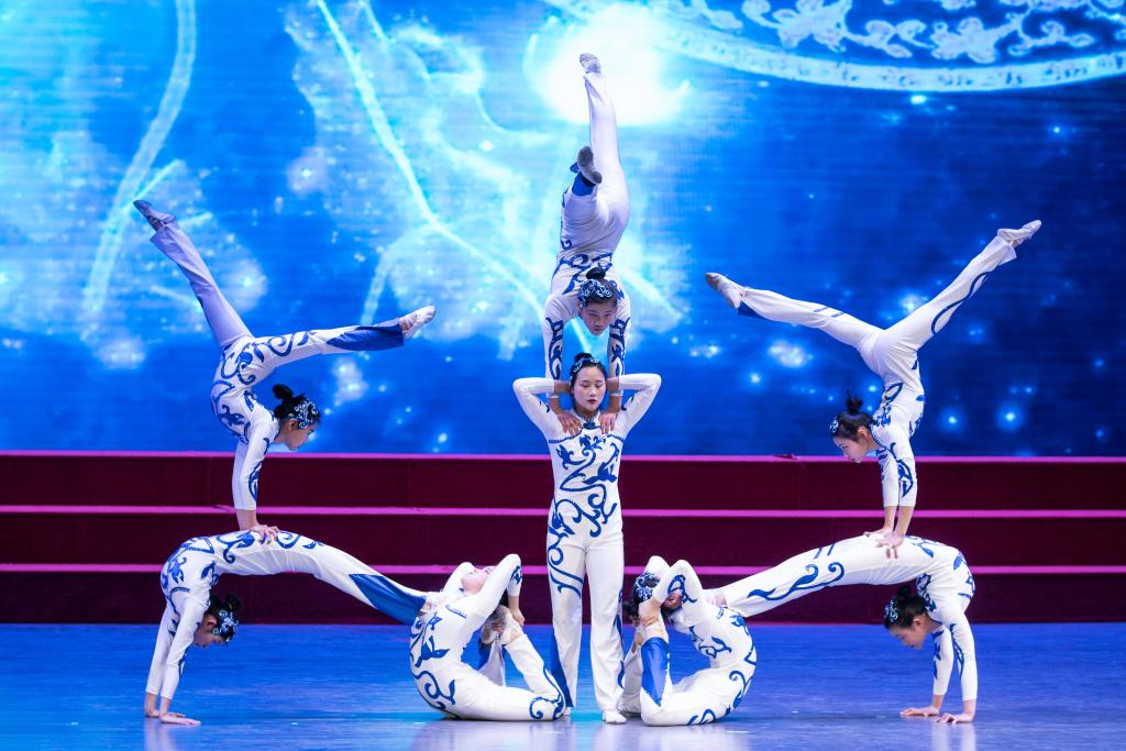 在学校清晨管乐团演奏的一曲恢弘大气的《万里长城永不倒》旋律中,展演序幕徐徐拉开。女子集体柔术《又见青花瓷》生动演绎各种高难度技艺,形体柔美优雅,古典韵味十足。大型魔术《超越空间》有中化无,无中生有,引得现场观众频频惊呼。双人技巧《月之恋》展现了在力量中创造出的身体平衡极限之美,给人以视觉的震撼。魔术短剧《乡村直播》带领观众切实感受文艺、互联网资源对乡村振兴发展的重要作用。杂技《魔幻水晶球》配合音乐,以静带动,变幻出一场美轮美奂的画面。杂技《高车踢碗》中一个接一个的碗自脚尖腾空而起并稳稳地垒落在头顶,赢得台下掌声一片。空竹表演《快乐空竹》中,表演的老人们炫起各种空竹技巧,圆盘状的空竹便忽上忽下,花样迭出,尽显最美“夕阳风采”。杂技《杂耍花坛》把传统顶缸技巧置于惊险的抛接技巧中,融合技巧与优美表演于一体。滚筒《星空遐想》,用杂技的形式表达人类对星空的无限遐想,给人耳目一新的视觉冲击。女子单杆《蝶·忆》紧紧抓住“蝶”的意象,把蝴蝶破茧、化蝶的自然过程演绎得绚烂夺目。魔术《春之语》传递着蓬勃向上的力量,表达对祖国的热爱与美好祝愿。