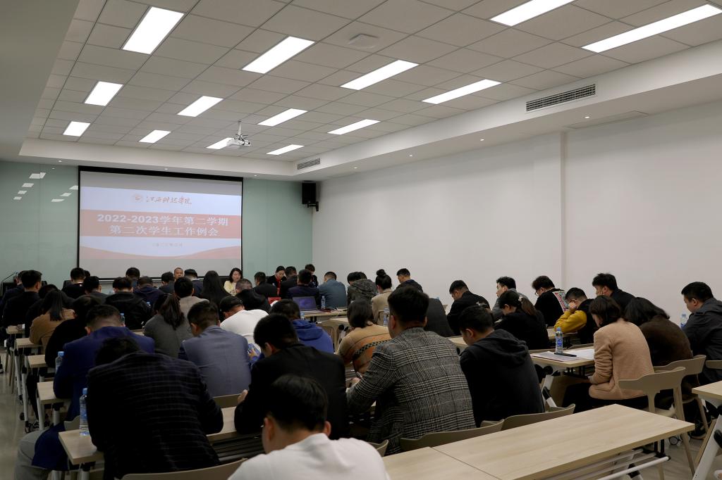江科网讯(记者 何强江)3月6日下午,我校召开2022-2023学年第二学期第二次学生工作会议。校党委副书记、副校长闵桂林出席并作工作部署。宣传部、学工处(部)、招就处、校团委(双创办)、学生资助管理中心、心理健康中心等部门科级以上干部,各学院学工副院长、学工秘书、党委专职副书记(团委书记)、校学生会主席团成员代表参加会议。