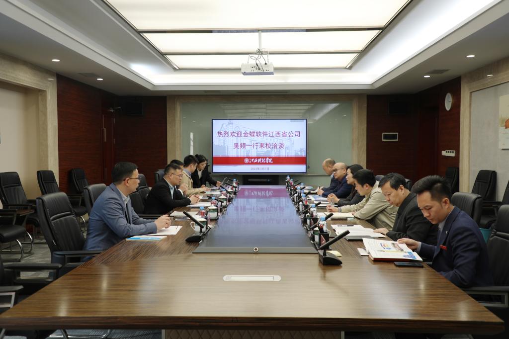 江科网讯(记者 刘莹)3月7日下午,金蝶软件江西省公司总经理吴频、金蝶精一总经理赵治国一行来我校洽谈校企合作事宜,受到校长张海涛、副校长李玮的热烈欢迎。双方在行政南一楼第三会议室开展座谈会。