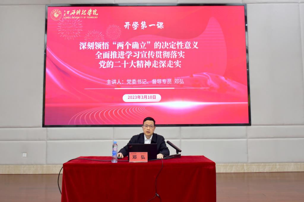 江科网讯(记者 何强江)为深入学习宣传贯彻党的二十大精神,教育引导广大师生以高昂斗志、饱满热情和奋斗姿态开启新的学期,踏上新的征程,3月10日下午,校党委书记邓弘通过线上线下相结合的方式为师生讲授2023年春季学期“开学第一课”。