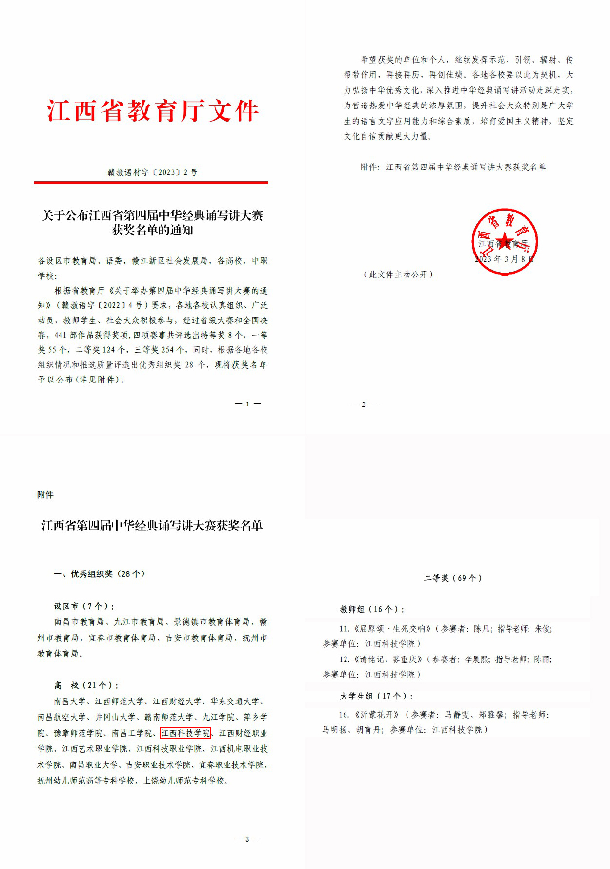 江科网讯(记者 何强江)近日,省教育厅公布了江西省第四届中华经典诵写讲大赛获奖名单和作品。我校党委宣传部陈凡老师的《屈原颂·生死交响》、音乐舞蹈学院李晨熙老师的《请铭记,雾重庆》获教师组二等奖;马静雯、郑雅馨等同学的《沂蒙花开》获大学生组三等奖,我校获得本次比赛“优秀组织奖”。