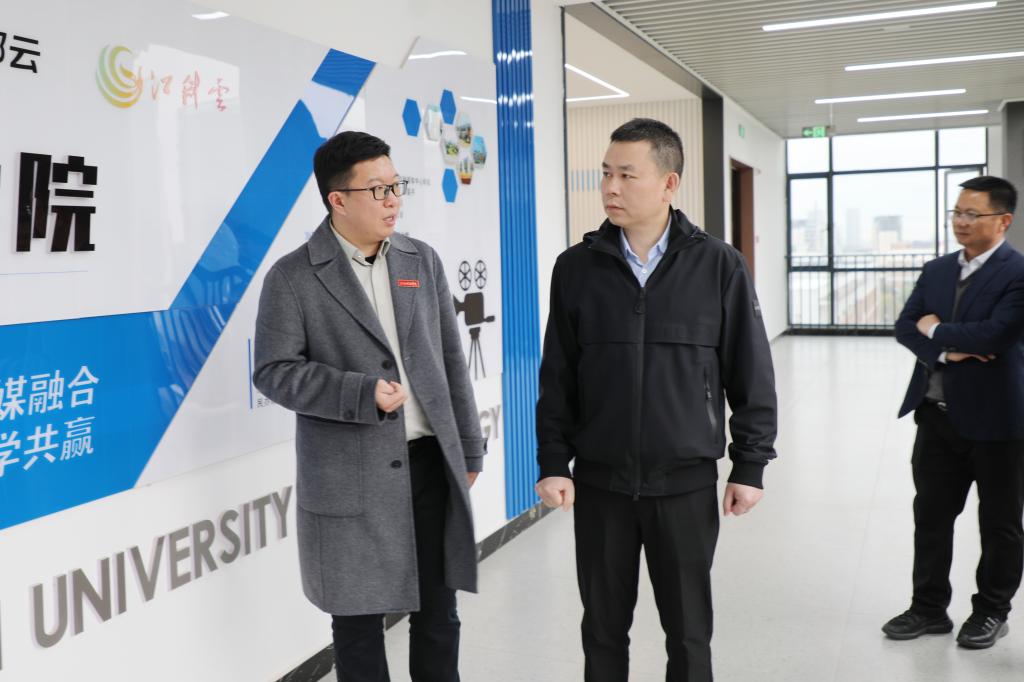 在于果主席及相关人员的陪同下,于辉一行先后来到文化与传媒学院映山红剧场、赣鄱云融媒学院、江科云智慧融媒直播基地、湖畔艺术中心、求真音乐厅、综合运动馆进行实地参观,对学校先进的教学设备、优美的校园环境、浓厚的育人氛围、特色鲜明的课程文化给予了充分肯定和高度赞扬。