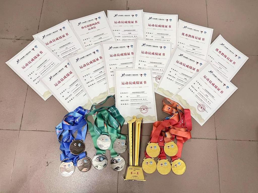 经过激烈角逐,我校武术散打队获得5块金牌、4块银牌、3块铜牌,专科甲组团体总分第一、本科甲组团体总分第五的佳绩,校队教练员、体育学院教学副院长罗卫东和体育学院教师廖粤生荣获“江西省优秀教练员”称号。