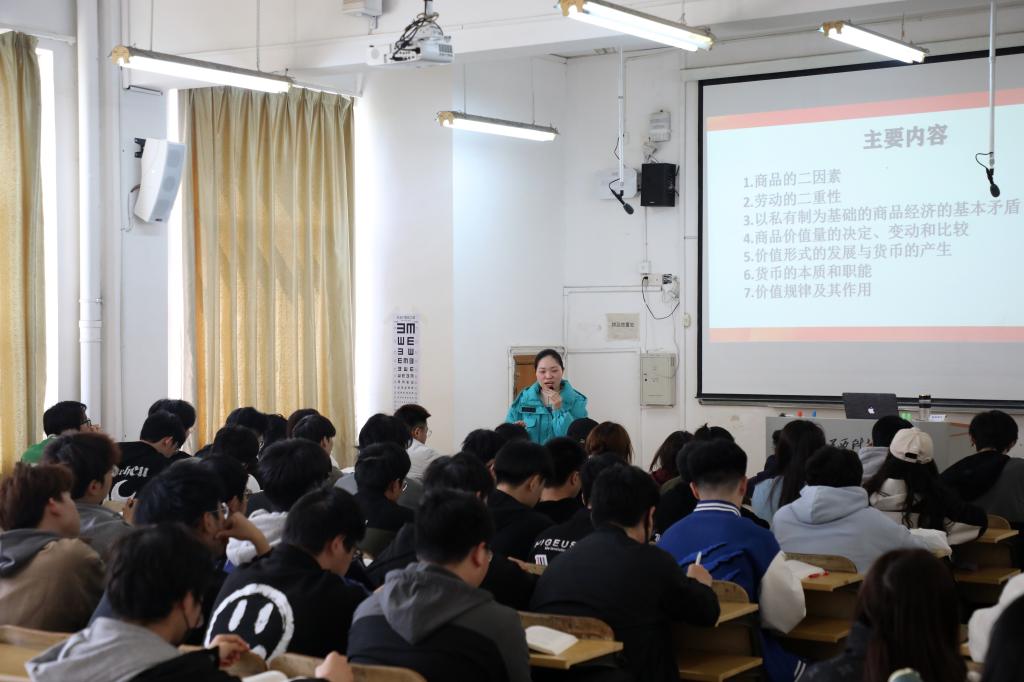 课堂上,王玲玲老师以问题的形式启发学生思考,结合通俗易懂的案例讲授“商品的二因素”“劳动的二重性”“以私有制为基础的商品经济的基本矛盾”“商品价值量的决定、变动和比较”“价值形式的发展与货币的产生”“货币的本质和职能”“价值规律及其作用”等内容。同学们认真听讲并积极主动参与课堂互动。