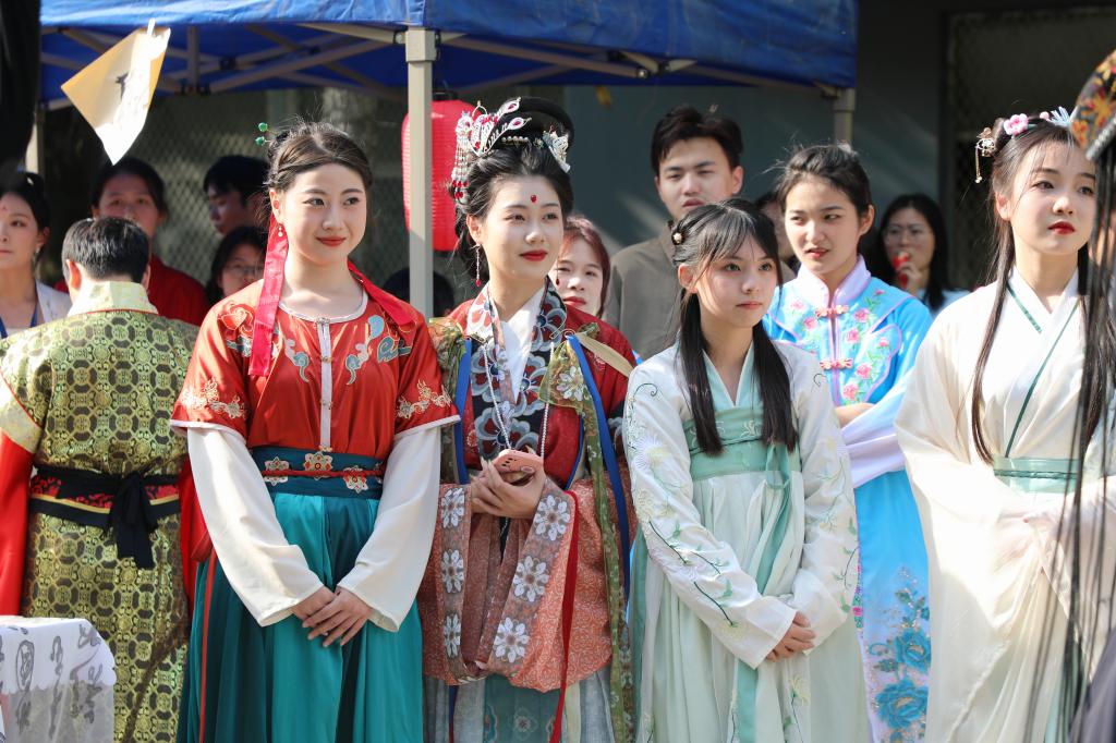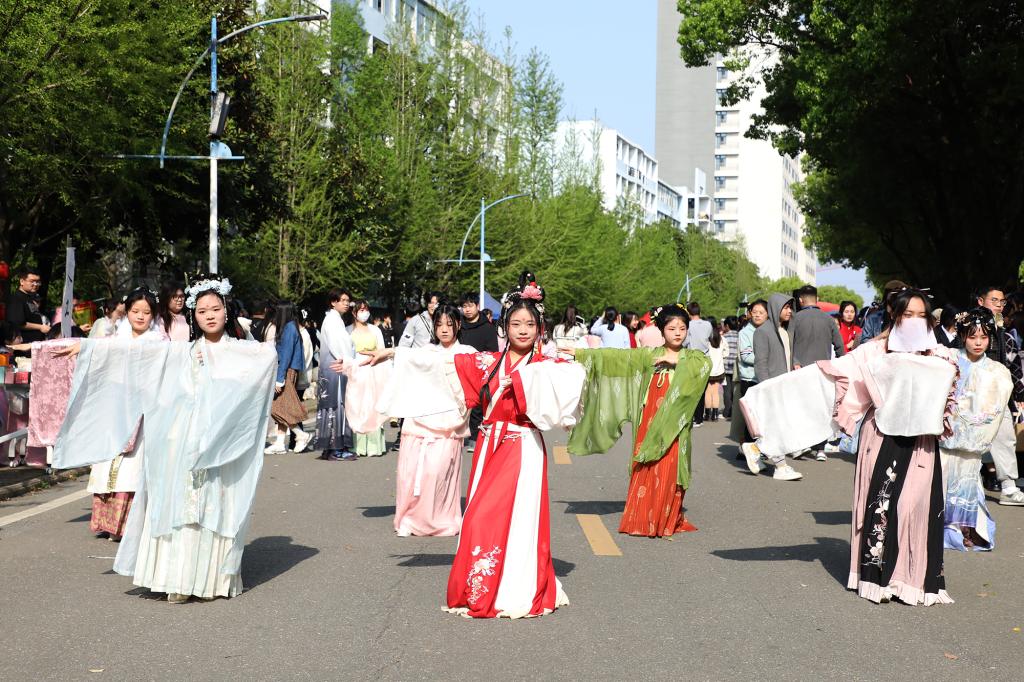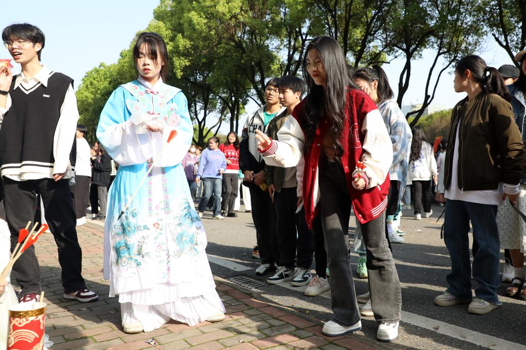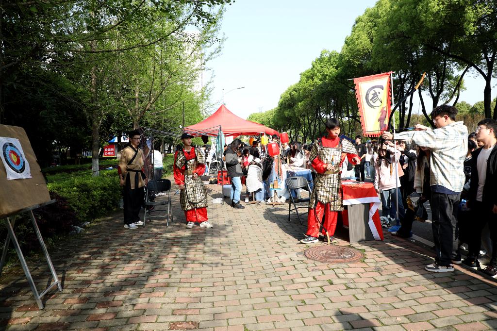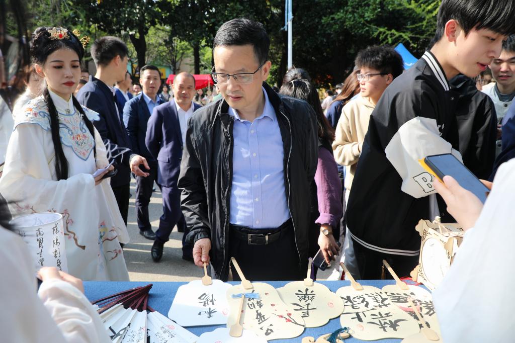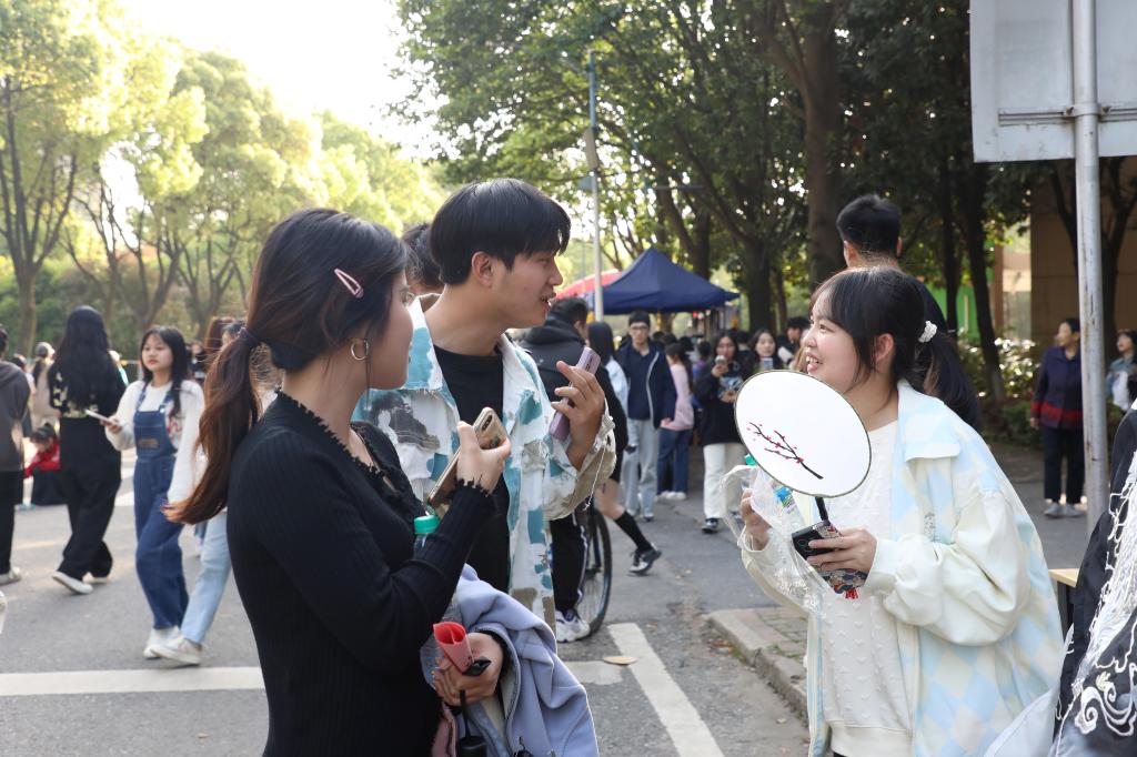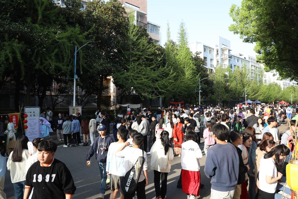 与此同时,一场国风古韵的游园会在紫薇路开启。游走在游园会,迎面遇见雍容华贵的“唐朝妃子”、身穿甲胄的“武士”、来回巡街的“衙门捕快”、吟诗作赋的“文人雅客”,让人仿佛瞬间穿越。除此之外,还有医馆药房衙门镖局、画舫香炉茶楼酒肆、投壶摇签蹴鞠套圈等,打造集体验、艺术、潮流于一体的沉浸式文化主题活动。师生在热闹非凡的游园会期间,或欣赏“艺人”表演,或穿梭于各类商铺,或参与藏宝游戏和体验互动。“平时就喜欢尝试穿戴唐朝服饰,今天穿着汉服在扇面上作画,然后又在古色古香环境,真的很美妙。”“我从小就喜欢做香囊,在制作香囊的过程中,我能够真正‘慢下来’用心感受生活的美好。”同学们表示,丰富的体验项目和浓厚的文化氛围,有效增强自身文化认同感和归属感,增强文化自觉和文化自信。