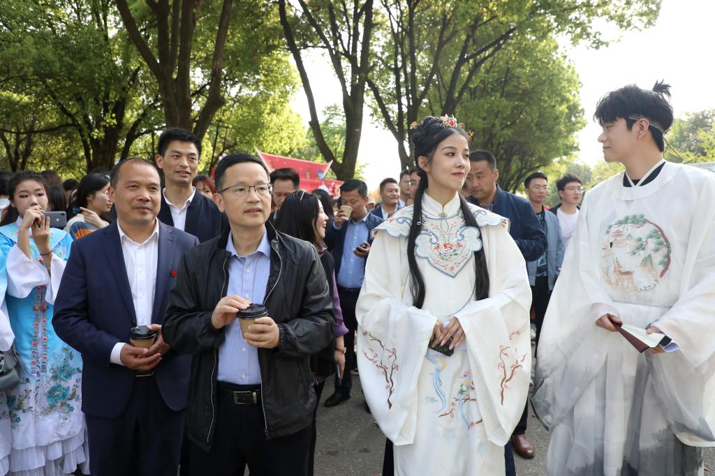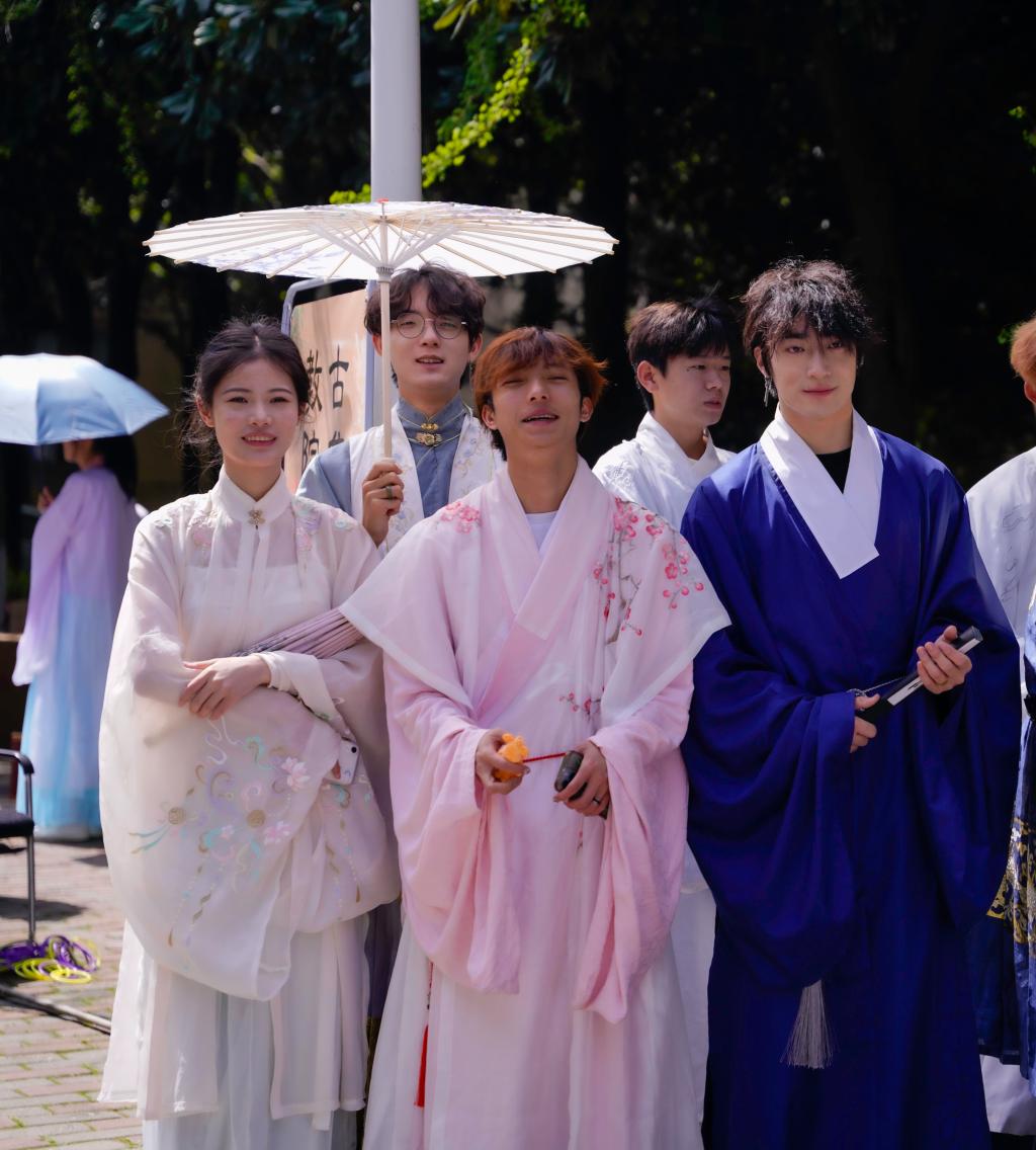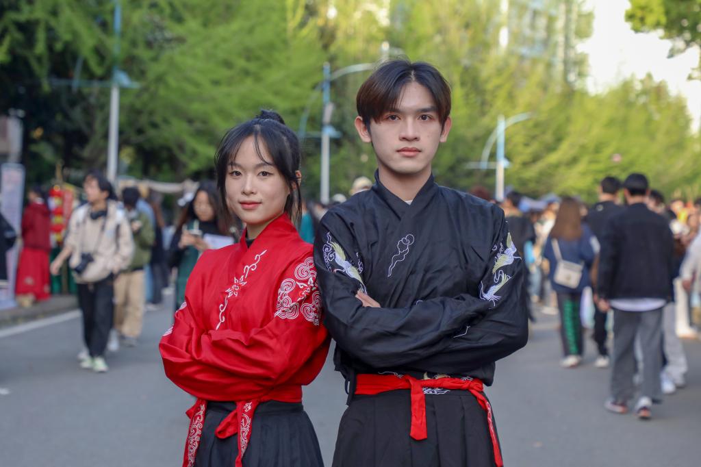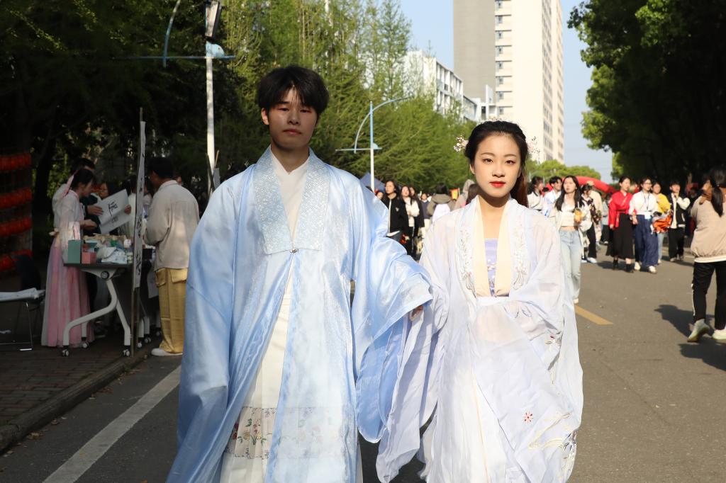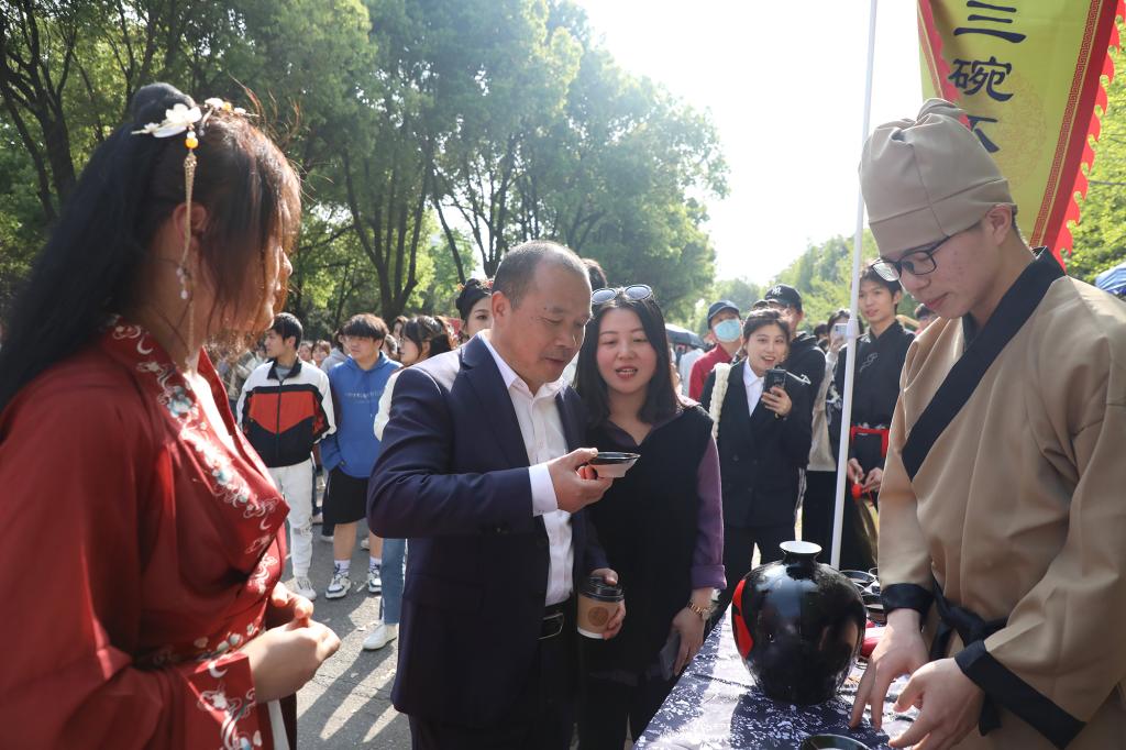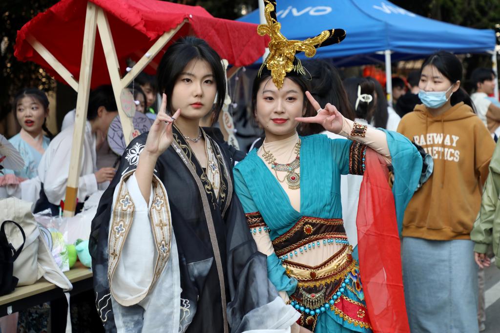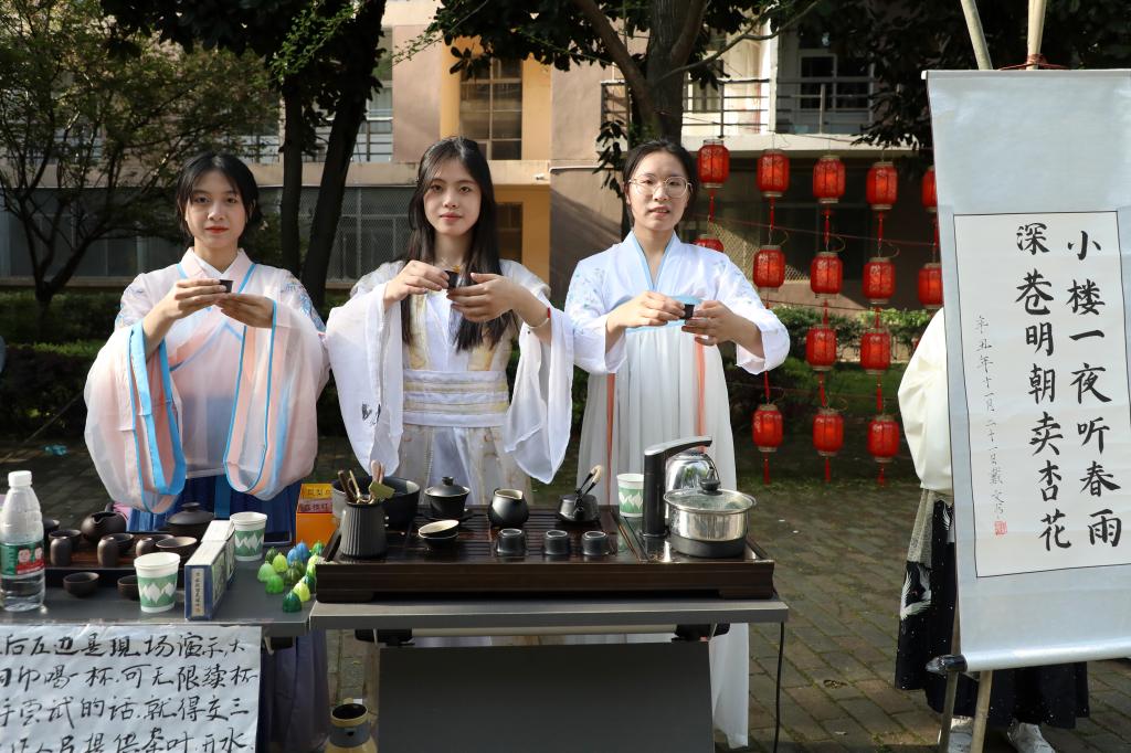 与此同时,一场国风古韵的游园会在紫薇路开启。游走在游园会,迎面遇见雍容华贵的“唐朝妃子”、身穿甲胄的“武士”、来回巡街的“衙门捕快”、吟诗作赋的“文人雅客”,让人仿佛瞬间穿越。除此之外,还有医馆药房衙门镖局、画舫香炉茶楼酒肆、投壶摇签蹴鞠套圈等,打造集体验、艺术、潮流于一体的沉浸式文化主题活动。师生在热闹非凡的游园会期间,或欣赏“艺人”表演,或穿梭于各类商铺,或参与藏宝游戏和体验互动。“平时就喜欢尝试穿戴唐朝服饰,今天穿着汉服在扇面上作画,然后又在古色古香环境,真的很美妙。”“我从小就喜欢做香囊,在制作香囊的过程中,我能够真正‘慢下来’用心感受生活的美好。”同学们表示,丰富的体验项目和浓厚的文化氛围,有效增强自身文化认同感和归属感,增强文化自觉和文化自信。