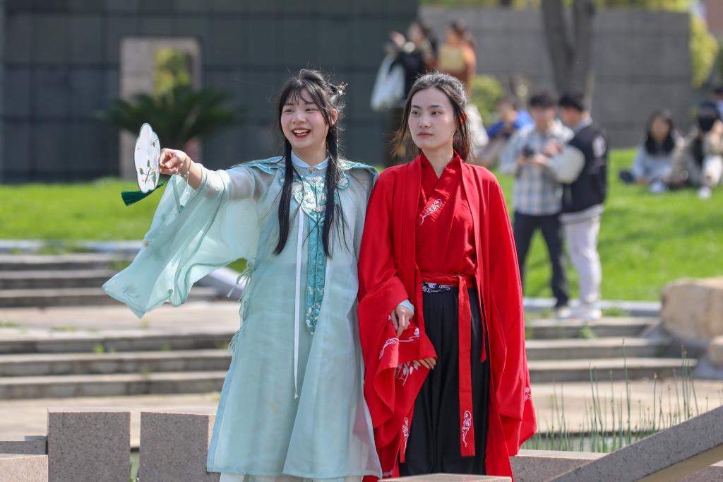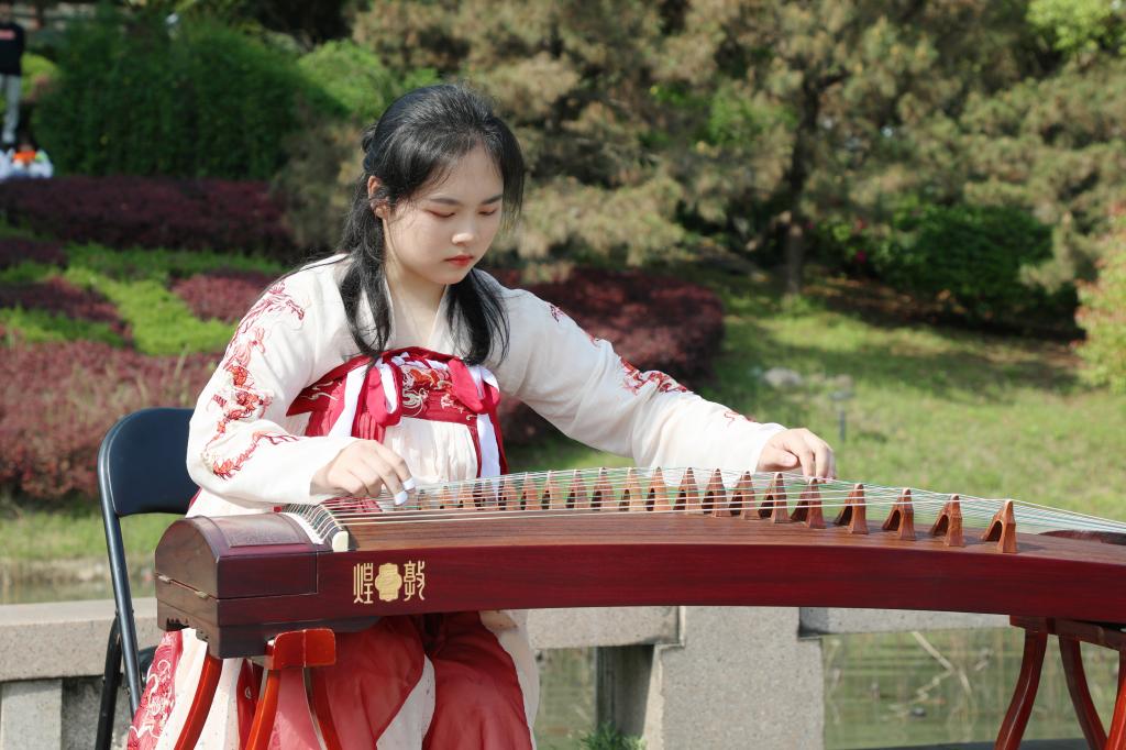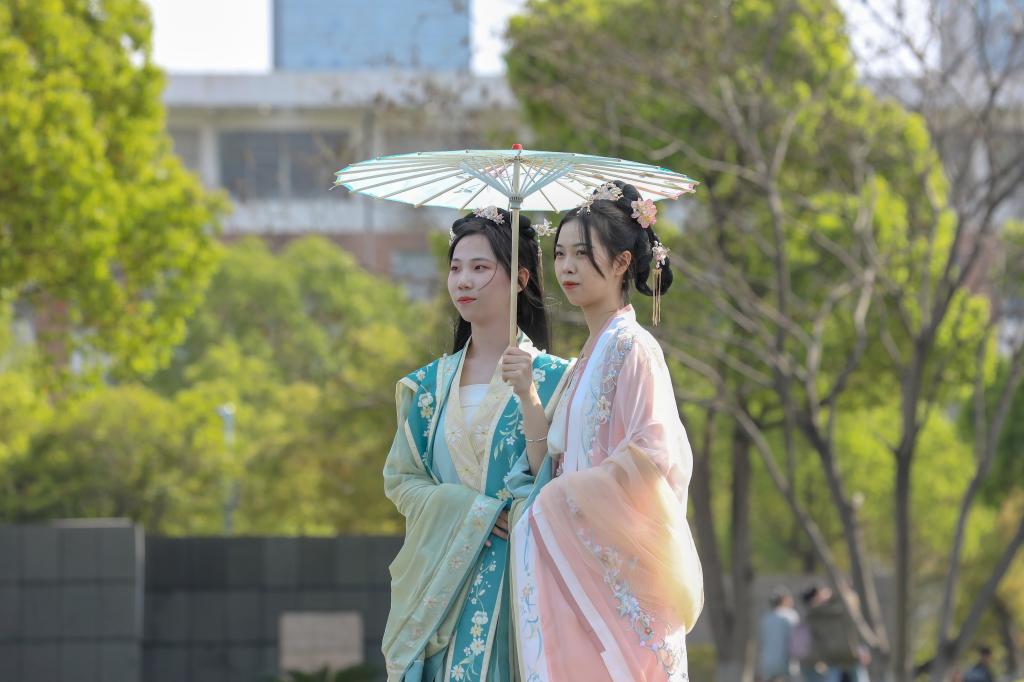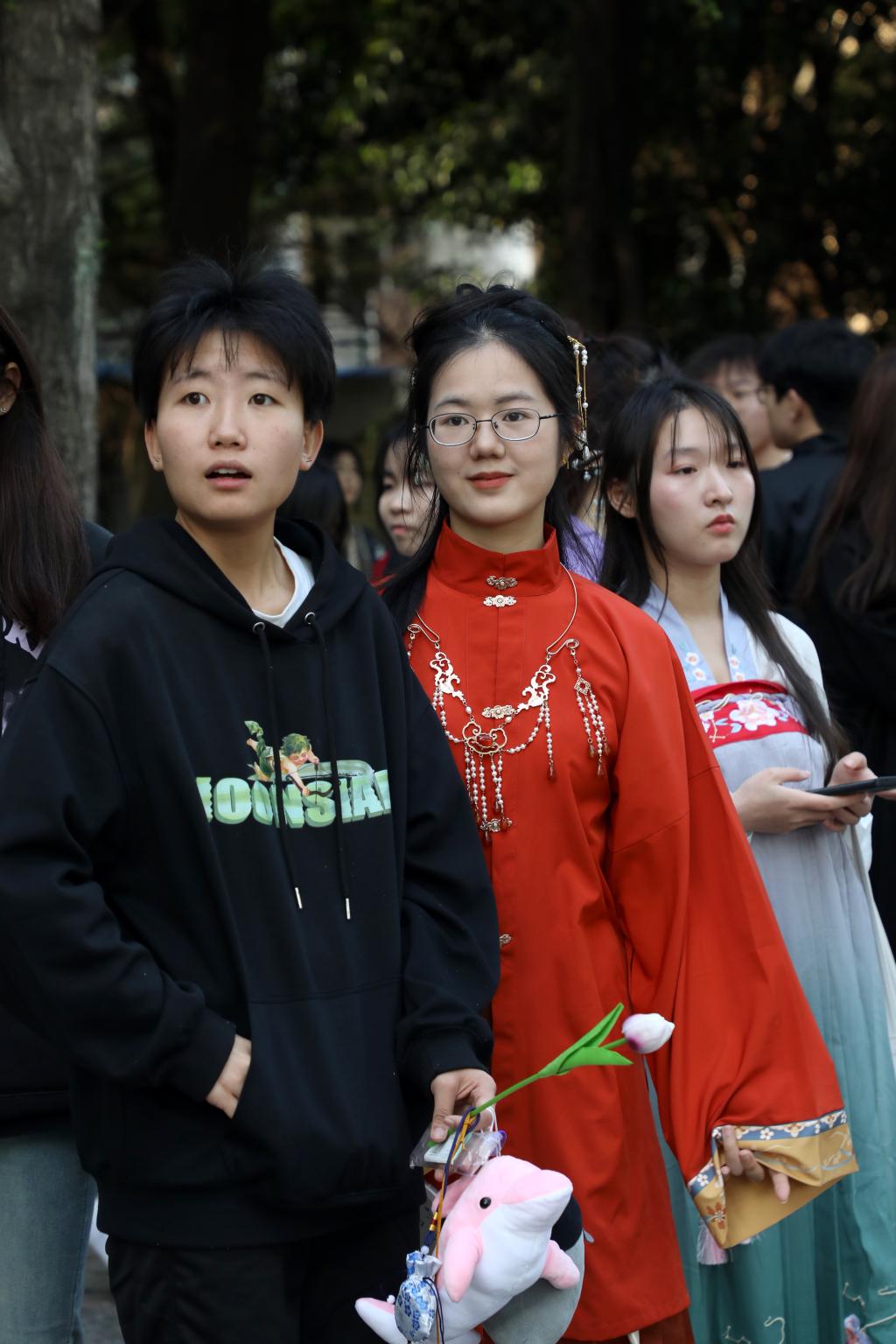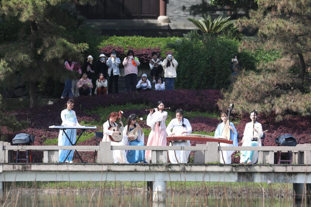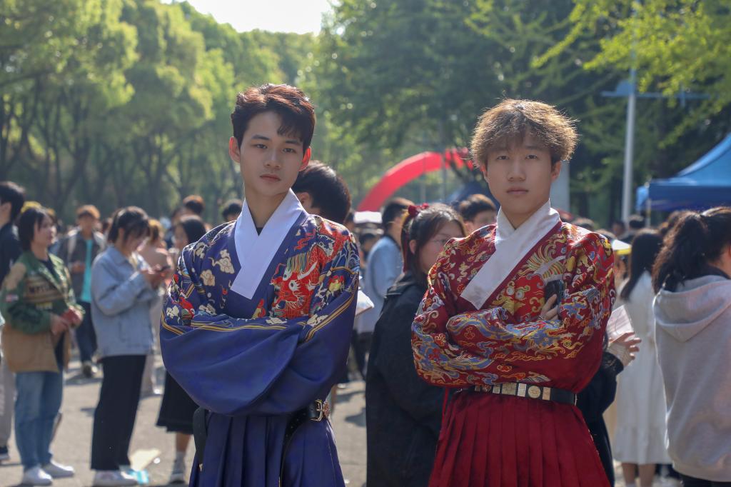 与此同时,一场国风古韵的游园会在紫薇路开启。游走在游园会,迎面遇见雍容华贵的“唐朝妃子”、身穿甲胄的“武士”、来回巡街的“衙门捕快”、吟诗作赋的“文人雅客”,让人仿佛瞬间穿越。除此之外,还有医馆药房衙门镖局、画舫香炉茶楼酒肆、投壶摇签蹴鞠套圈等,打造集体验、艺术、潮流于一体的沉浸式文化主题活动。师生在热闹非凡的游园会期间,或欣赏“艺人”表演,或穿梭于各类商铺,或参与藏宝游戏和体验互动。“平时就喜欢尝试穿戴唐朝服饰,今天穿着汉服在扇面上作画,然后又在古色古香环境,真的很美妙。”“我从小就喜欢做香囊,在制作香囊的过程中,我能够真正‘慢下来’用心感受生活的美好。”同学们表示,丰富的体验项目和浓厚的文化氛围,有效增强自身文化认同感和归属感,增强文化自觉和文化自信。