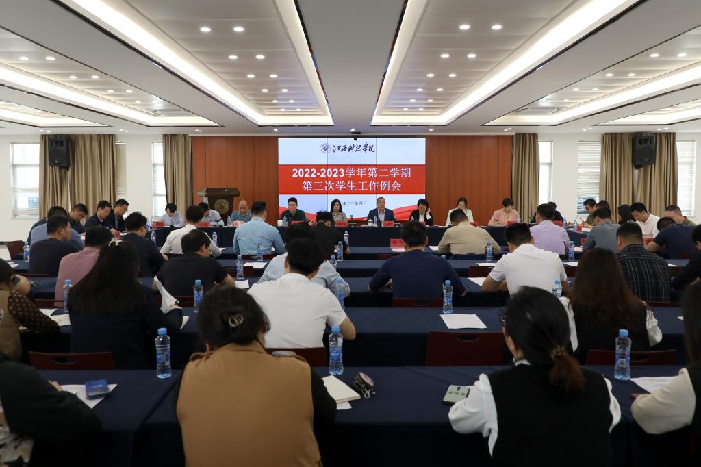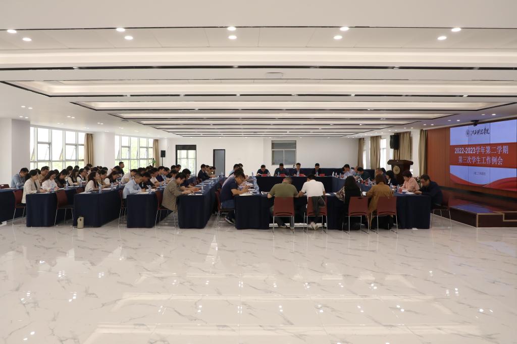 江科网讯(记者 何强江)4月12日下午,我校在行政南三楼会议室召开2022—2023学年第二学期第三次学生工作例会。校长张海涛,校党委副书记、副校长闵桂林,副校长周冰冰出席会议。宣传部、学工处、招就处、校团委(双创办)、学生资助管理中心、心理健康中心、保卫处等部门科级以上干部,各学院学工副院长、学工秘书、党委专职副书记(团委书记),校学生会主席团成员代表参加会议。