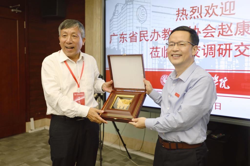 赵康会长对我校先进的教学设备、优美的校园环境、浓厚的育人氛围、特色鲜明的课程文化、体系化的校企合作与产教融合路径表示充分肯定和高度赞扬,并介绍广东民办高校发展现状及存在问题。他表示,此次来江科调研交流,收获颇丰、超出预期。江科在党建育人、思政育人等方面布局合理、建设水准高、特色鲜明,值得学习借鉴。他指出,民办高校为教育事业作出了特殊贡献,民办高校教育工作者要坚定情怀、坚守初心,带着深深的自豪感办好人民满意的教育,真正把教育发展成果惠及全体人民。最后,赵康会长真诚邀请我校领导带队赴广东进行深度调研交流,共同探讨民办教育改革发展。