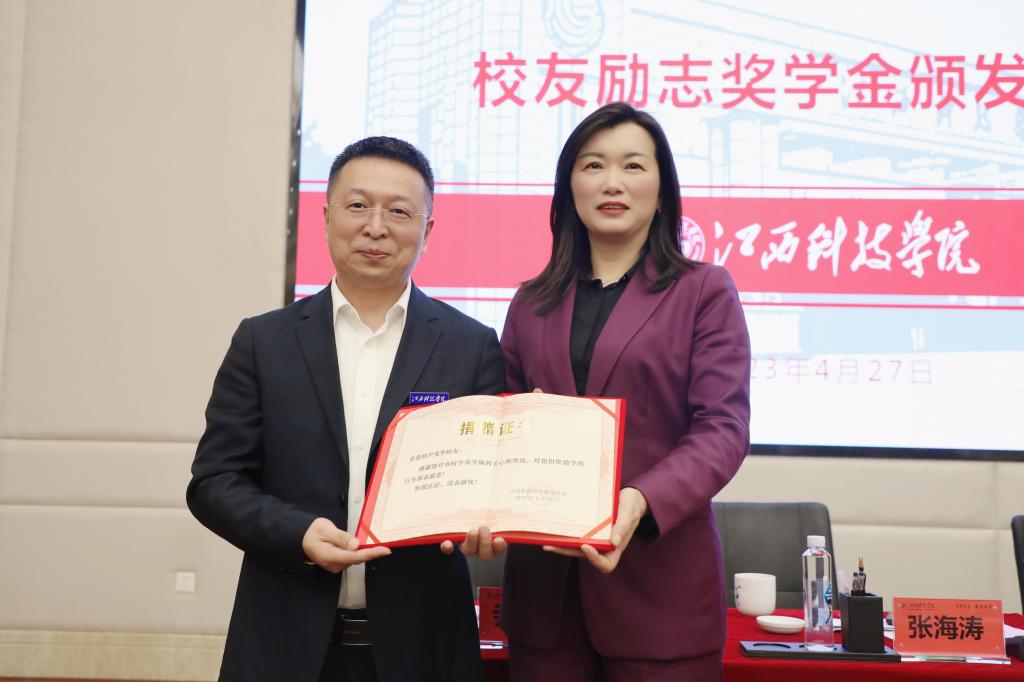 江科网讯(记者 刘莹)4月27日下午,学校在行政南一楼第一会议室举办彭丽丽、尹茂华校友励志奖学金颁发仪式。校长张海涛,校党委副书记、副校长闵桂林;2001级计算机专业校友、上海唔喤新材料集团有限公司法定代表尹茂华,2004届计算机专业校友、北京金添仕制衣有限公司创办人彭丽丽出席活动。校(党)办、学工处、学生资助中心、招就处负责人,各学院学工副院长、学工秘书、获奖学生及学生代表参会。仪式由招就处处长吴丽娟主持。