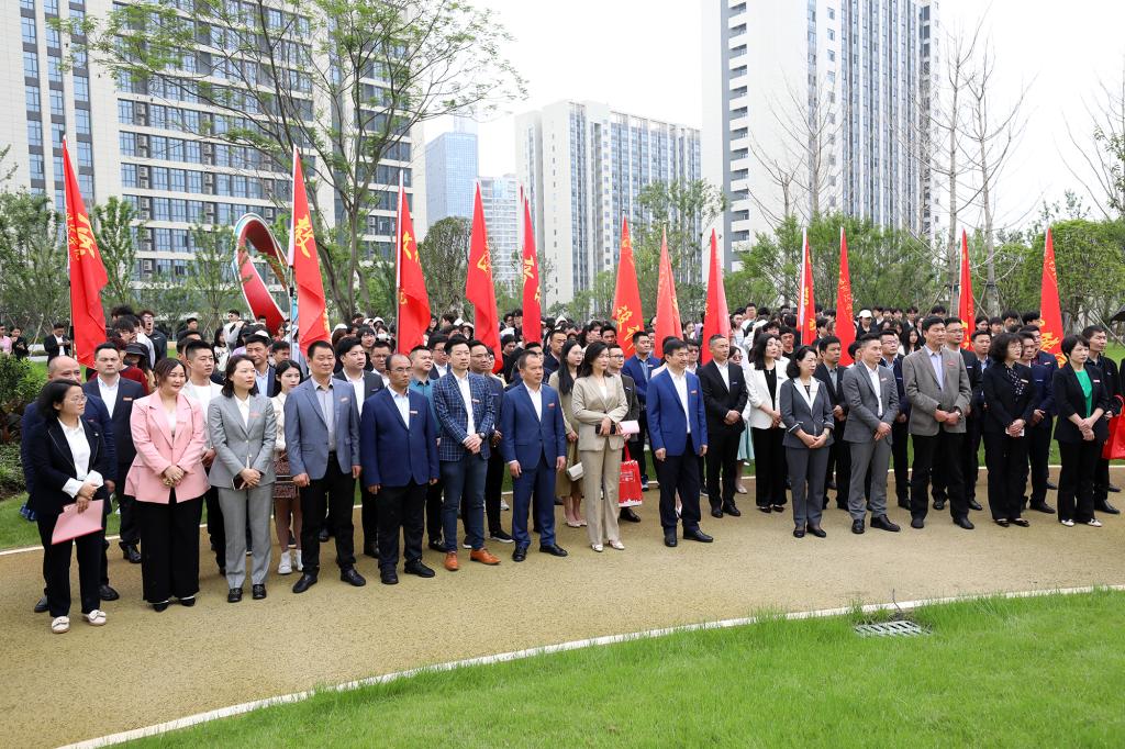 于果董事长、邓弘书记、张海涛校长与彭丽丽、尹茂华、陈跃评、张永乐、王子金等五位校友共同为铜像揭幕。揭幕仪式后,与会校领导和校友代表合影留念。