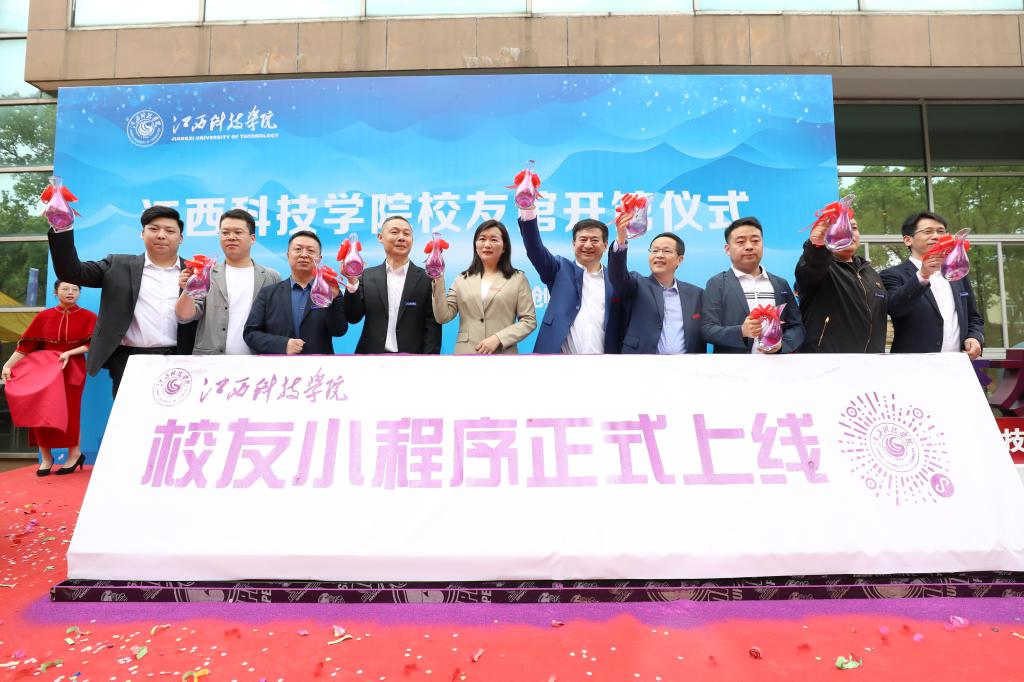 接着,闵桂林副校长宣布校友小程序上线。于果董事长、邓弘书记、张海涛校长与江期胜、曹建、王朝、王子金、王丁丁、尹茂华、许长发等七位校友代表一同为校友小程序正式上线洒金。