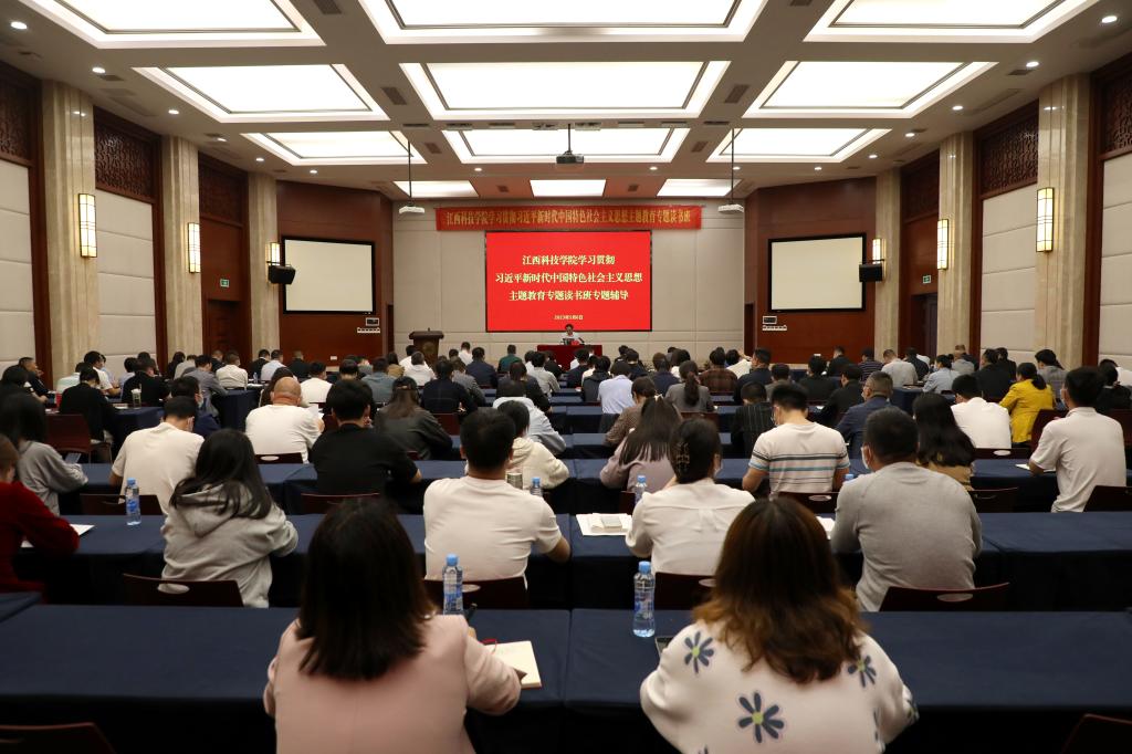江科网讯(记者 何强江)5月6日下午,我校在行政南一楼第一会议室举行学习贯彻习近平新时代中国特色社会主义思想主题教育专题读书班第二场辅导报告会。全国优秀教师、南昌大学马克思主义学院刘涛教授应邀作题为《深入学习领会习近平新时代中国特色社会主义思想的重大意义》的辅导报告。校党委书记邓弘,副校长林素君、李玮、周冰冰、陈辉等全体在家校领导到场聆听。校党委副书记夏拥华主持报告会。