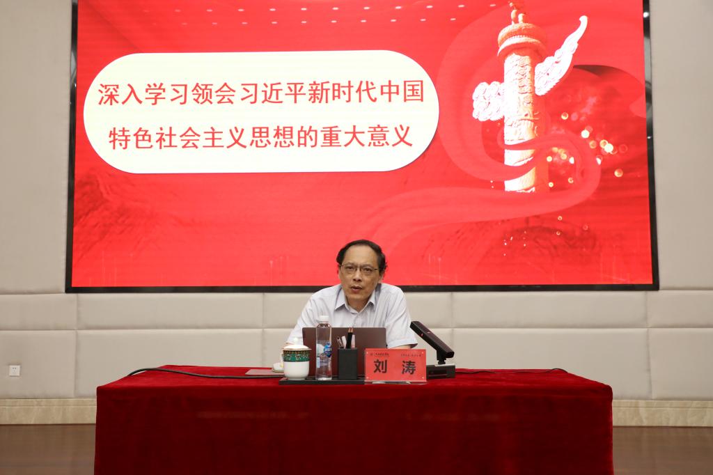 刘涛教授首先从“世情”“国情”“党情”三个维度阐述开展学习贯彻习近平新时代中国特色社会主义思想主题教育的时代背景,并深入浅出地阐释开展主题教育的目的意义。他表示,习近平新时代中国特色社会主义思想是对马克思列宁主义、毛泽东思想、邓小平理论、“三个代表”重要思想、科学发展观的继承和发展,是当代中国马克思主义、二十一世纪马克思主义,是中华文化和中国精神的时代精华,是党和人民实践经验和集体智慧的结晶,是中国特色社会主义理论体系的重要组成部分,是全党全国人民为实现中华民族伟大复兴而奋斗的行动指南,必须长期坚持并不断发展。开展这次主题教育的目的意义,说到底就是要用这一思想武装全党,并运用这一思想指导全党为实现中华民族伟大复兴而奋斗。刘涛教授还就“什么是自我革命”、“为什么中国共产党能坚持自我革命,勇于自我革命”以及“自我革命精神是什么”同大家进行交流。他表示,全面从严治党是新时代党的自我革命的伟大实践,开辟了百年大党自我革命的新境界。要以彻底的自我革命精神继续推进新时代党的建设新的伟大工程。探索依靠党的自我革命跳出历史周期率的成功路径需要新的理论指导,破解大党独有难题需要新的理论与对策。他最后强调,新的征程上,要深刻领悟“两个确立”的决定性意义,增强“四个意识”、坚定“四个自信”、做到“两个维护”,更加紧密地团结在以习近平同志为核心的党中央周围,全面贯彻习近平新时代中国特色社会主义思想,牢记空谈误国、实干兴邦,坚定信心、同心同德,埋头苦干、奋勇前进,为全面建设社会主义现代化国家、全面推进中华民族伟大复兴而团结奋斗。