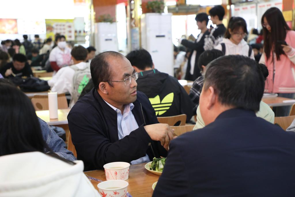 中午,陈辉副校长来到学生食堂与21本会计1班的同学们共进午餐,亲切询问学生日常生活学习情况,关心学生身体,鼓励同学们多与学校沟通,及时反馈问题,积极践行光盘行动。午餐后,陈辉副校长还走访了学生寝室,深入了解学生住宿情况,嘱咐同学们养成良好生活习惯,不断完善自己、提升自己,敢于思考、勤于琢磨、勇于实践,以积极向上的精神面貌、认真踏实的学习态度,做一名合格的新时代青年大学生。