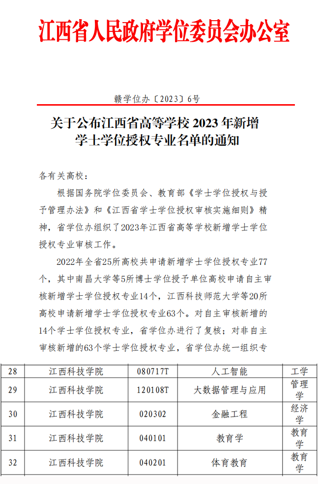 江科网讯(通讯员 秦琛 记者 何强江)近日,江西省教育厅下发《关于公布江西省高等学校2023年新增学士学位授权专业名单的通知》(赣学位办〔2023〕6号),我校人工智能、大数据管理与应用、金融工程、教育学和体育教育等5个本科专业顺利通过教育厅审核程序,新增为学士学位授权专业。