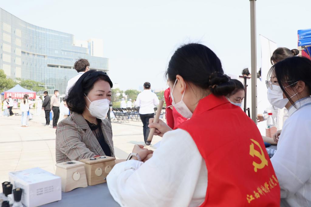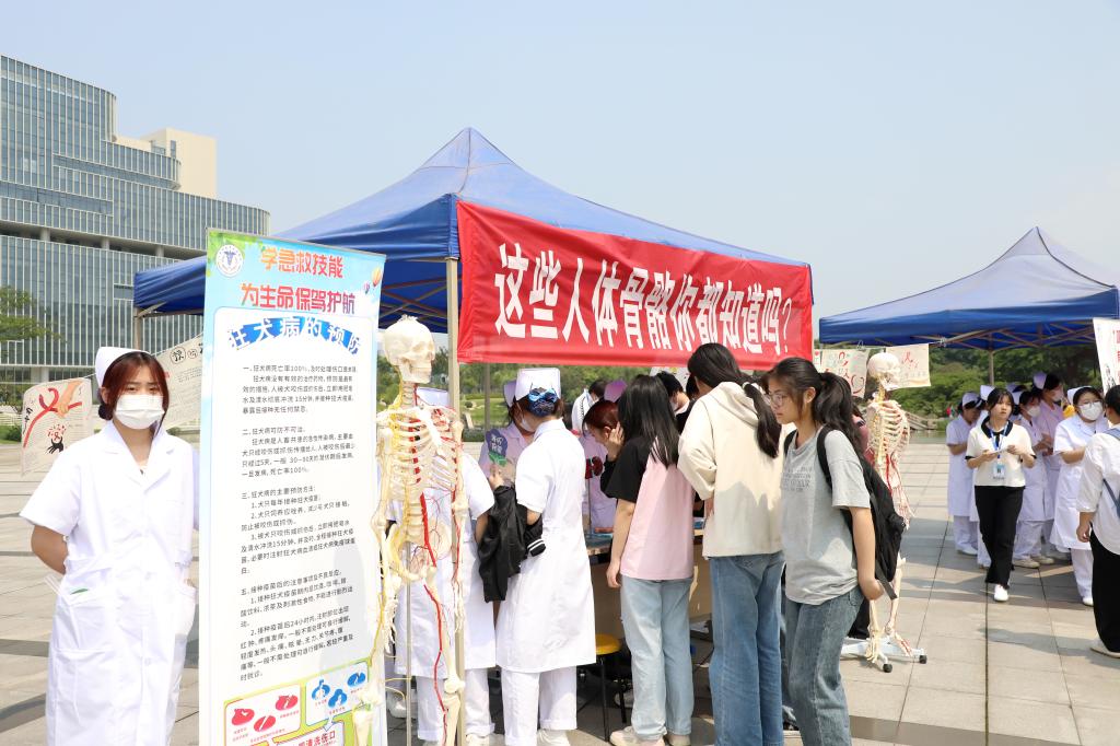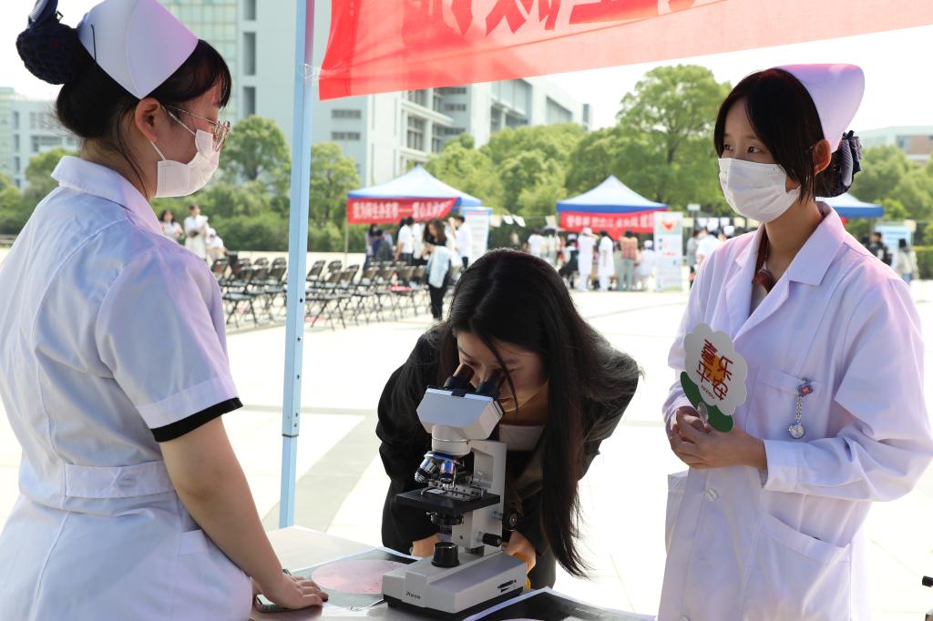 测量血糖血压,学习海姆利克急救法、心肺复苏法,体验艾灸、按摩、刮痧,参与医学知识问答、人体骨骼知识普及、“小玻片,大世界”显微镜体验等游戏互动,聆听医学知识宣讲,观看防艾手抄报展……丰富的项目、热情的服务让师生不禁点赞。