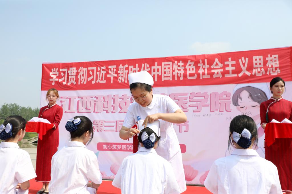 文化节开幕式上,同学们用国风舞蹈、八段锦、护理礼仪等展示表演向师生展现有自信、有情怀、敢担当、有作为的新时代护理事业接班人的英姿,表达护理青年一代对新时代的礼赞。校领导为基础技能大赛、科普讲解大赛、笔记评选比赛颁奖。“……尽力提高护理之标准,慎守病人家务及秘密。竭诚协助医生之诊治,务谋病者之福利。谨誓!”在“薪火相传,新老相继”的授帽仪式后,基护教研室主任徐萍带领学生代表进行庄严宣誓。21本护理3班的赖桑是这次授帽仪式中的一员,她表示:“当老师为自己戴上护士帽的那一刻,我深深深感受到护士这个职业的伟大和责任。今后,我要努力练就过硬本领,将来以更加专业的知识和技能投入到护士这个职业当中,竭力帮助病患恢复健康。”