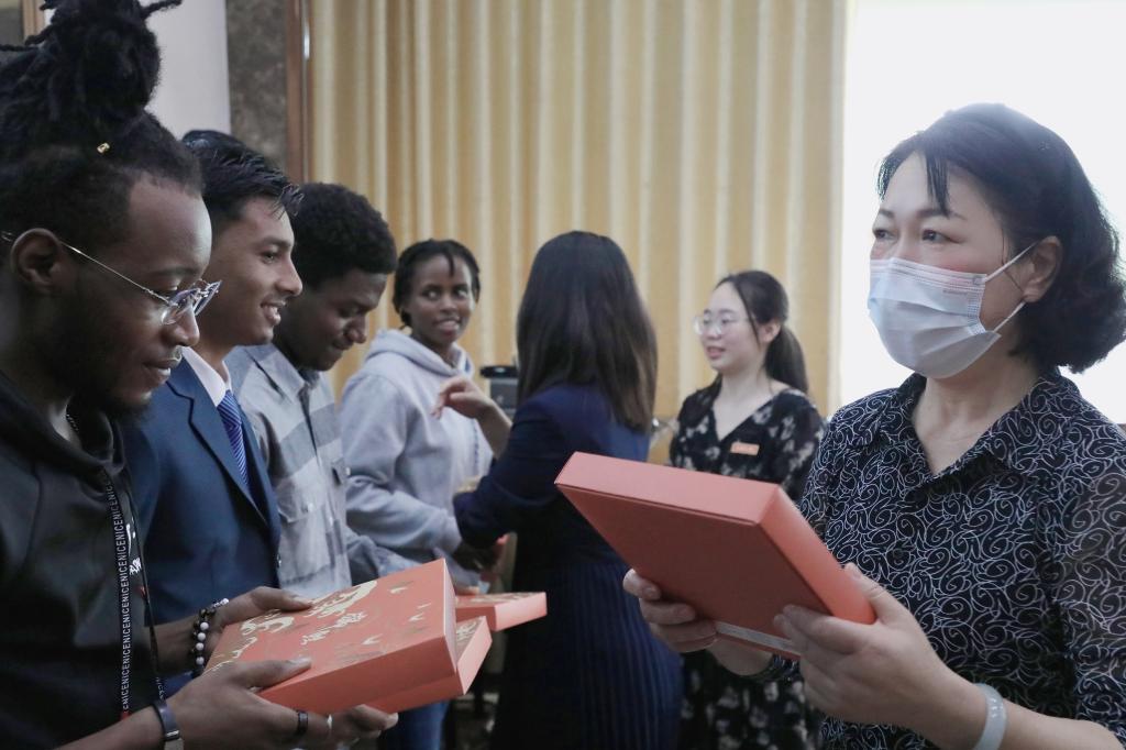 “我喜欢游泳……”“希望可以结交很多中国朋友……”留学生们现场与老师们积极交流,分享自己的兴趣爱好和对未来的发展规划,表示会尽快适应新环境,彼此互相尊重,和睦相处,努力学习。活动最后,林素君副校长向留学生们赠送锦鲤纪念品,传递学校的浓厚心意。