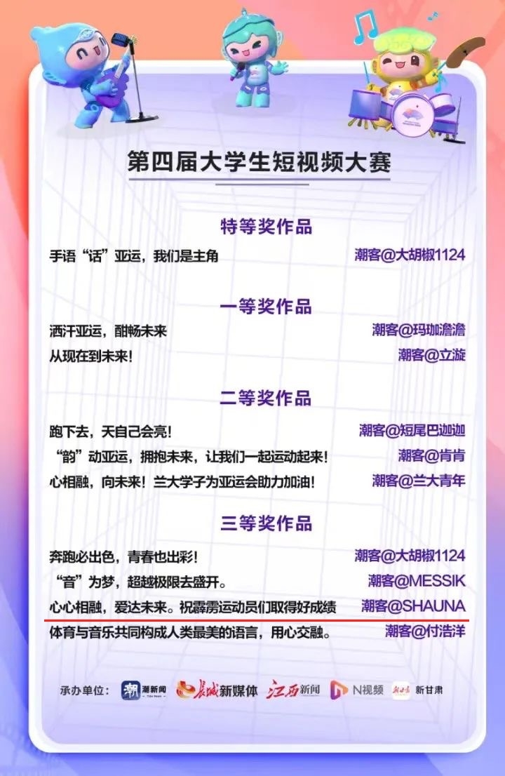 在典礼现场公布的获奖结果中,由我校文化与传媒学院陈传佳、邓玉婷、奉芊、李雅婷等同学共同创作的《心心相融爱达未来祝霹雳舞运动员们取得好成绩》视频作品荣获大赛三等奖,指导老师张文卿获“优秀指导教师”称号,文化与传媒学院(赣鄱云融媒学院)荣获“优秀组织奖”。