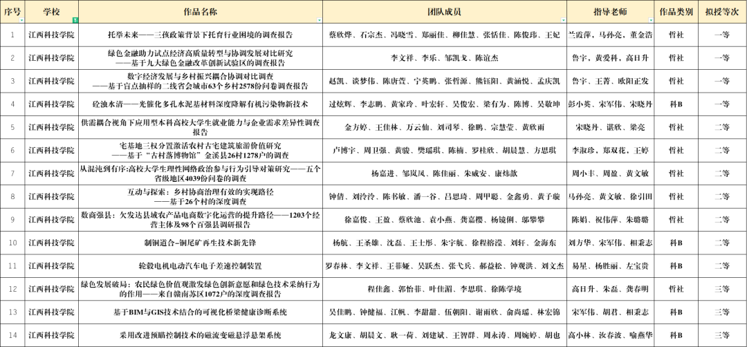 本届竞赛省内共计106所高校参与,204件作品进入终审决赛。经过现场质询、答辩评审等环节的激烈角逐,教育学院《托举未来——三孩政策背景下托育行业困境的调查报告》、财经学院《绿色金融助力试点经济高质量转型与协调发展对比研究——基于九大绿色金融改革创新试验区的调查报告》和《数字经济发展与乡村振兴耦合协调对比调查——基于盲点抽样的二线省会城市63个乡村2578份问卷调查报告》、城市建设学院《砼浊水清——光催化多孔水泥基材料深度降解有机污染物新技术》4件作品获评一等奖。管理学院《供需耦合视角下应用型本科高校大学生就业能力与企业需求差异性调查报告》和《宅基地三权分置激活农村古宅建筑旅游价值研究——基于“古村落博物馆”金溪县26村1278户的调查》和财经学院《从混沌到有序:高校大学生理性网络政治参与行为引导对策研究——五个省级地区4039份问卷的调查》等7件作品获评二等奖。财经学院《绿色发展破局:农民绿色价值观激发绿色创新意愿和绿色技术采纳行为的作用——来自赣南苏区1072户的深度调查报告》、城市建设学院《基于BIM与GIS技术结合的可视化桥梁健康诊断系统》、人工智能学院《采用改进预瞄控制技术的磁流变磁悬浮悬架系统》3件作品获评三等奖。