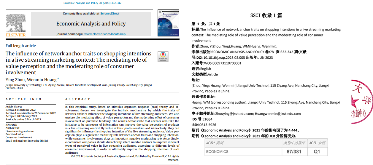江科网讯(通讯员李海艳)日前,我校习近平新时代中国特色社会主义思想研究中心周盈和黄文敏老师在《Economic Analysis and Policy》上发表题为“The influence of network anchor traits on shopping intentions in a live streaming marketing context: The mediating role of value perception and the moderating role of consumer involvement”的学术论文。《Economic Analysis and Policy》期刊属于SSCI,JCR一区,影响因子4.444。