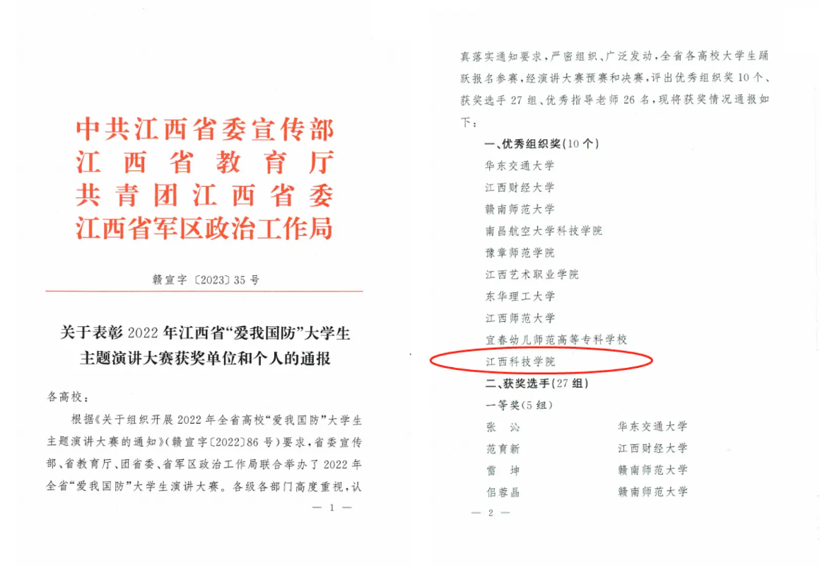 近日,由省委宣传部、省教育厅、团省委、省军区政治工作局联合举办的2022年全省“爱我国防”大学生演讲大赛顺利落下帷幕。经演讲大赛预赛和决赛,音乐舞蹈学院庄园、叶紫萱同学荣获大赛三等奖,音乐舞蹈学院教研室主任张璨、宣传部技术科科长梁京闽获“优秀指导老师”称号,学校荣获“优秀组织奖”。