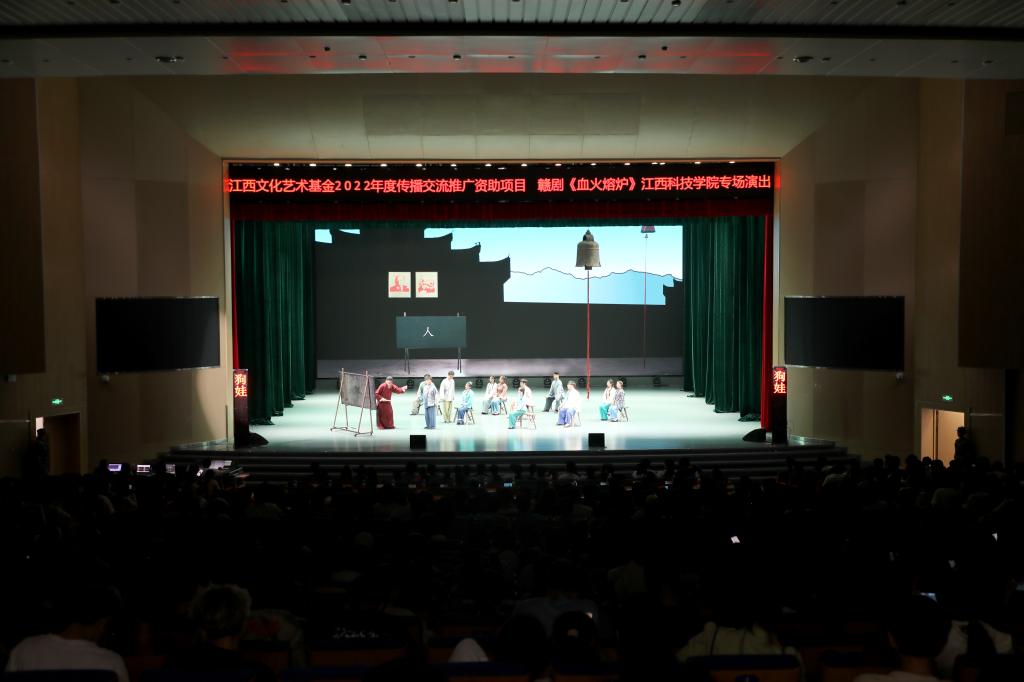 江科网讯(记者 何强江)为创新学习贯彻习近平新时代中国特色社会主义思想主题教育形式,引导师生传承红色基因,增强爱国情感,6月6日晚,江西文化艺术基金2022年度传播交流推广资助项目——赣剧《血火熔炉》在我校蓝海大剧场开演。原省赣剧院书记、院长喻小梅,省赣剧院书记、院长李媛媛,烟台科技学院党委书记王少鹏一行,校(党)办主任刘箫等与师生一同参与这场别开生面的“党史教育课”。