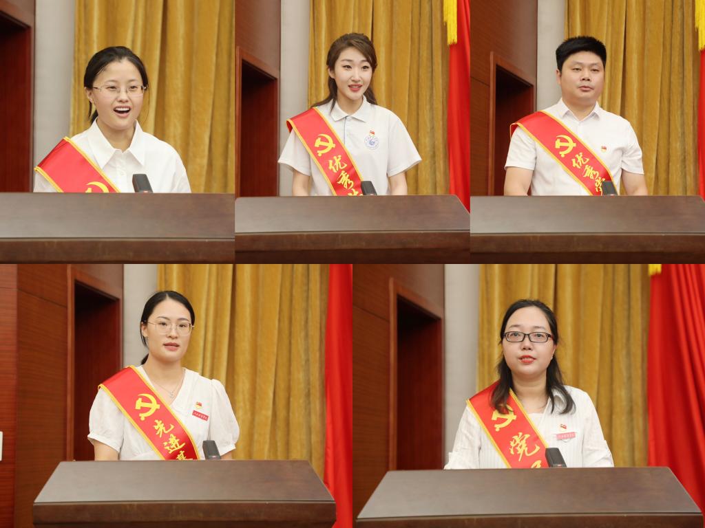 优秀共产党员教工代表、人工智能学院专任教师梁艳,优秀共产党员学生代表、音乐舞蹈学院20本播音2班石若琦,优秀党务工作者代表、教育学院汤佳伟,先进基层党组织代表、协同创新中心张乐芳,“党员示范岗”代表、招生就业处魏文颖依次上台发言。大家表示,在今后的工作学习中,将不忘初心、继续奋斗,把表彰作为鞭策,把荣誉作为力量,坚持不懈用习近平新时代中国特色社会主义思想凝心铸魂,为学校高质量发展贡献力量。