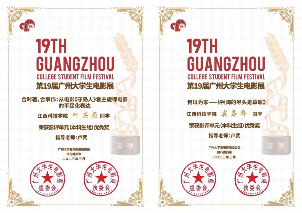 在第19届广州大学生电影展作品评选大赛中,我校文化与传媒学院22本编导4班叶实亮同学的影评《合时著,合事作:从电影<守岛人看主旋律电影的平民化表达》和22本编导5班袁嘉粤同学的影评《何以为家——评<海的尽头是草原>》获得大赛影评单元(本科生组)优秀奖。