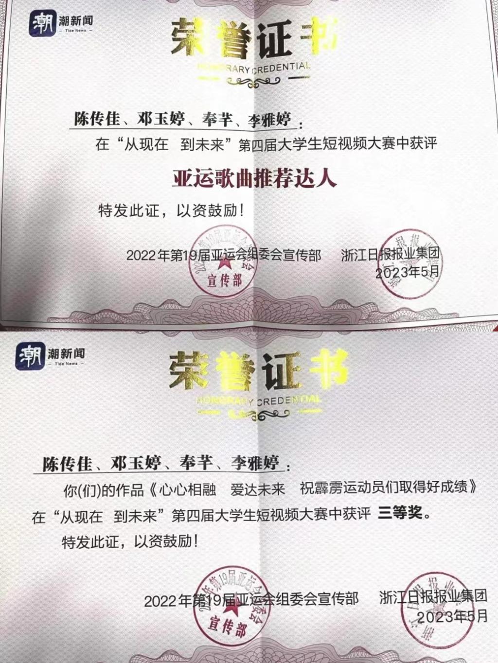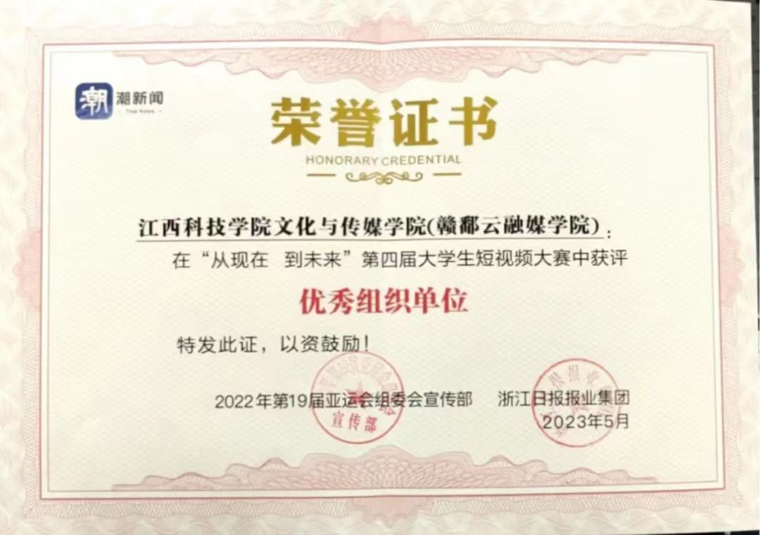 在第19届亚运会组委会宣传部和浙江日报报业集团共同主办的第四届大学生短视频大赛中,由我校文化与传媒学院陈传佳、邓玉婷、奉芊、李雅婷等同学共同创作的《心心相融 爱达未来 祝霹雳舞运动员们取得好成绩》视频作品荣获大赛三等奖,指导老师张文卿获“优秀指导教师”称号,江西科技学院文化与传媒学院(赣鄱云融媒学院)荣获“优秀组织奖”。