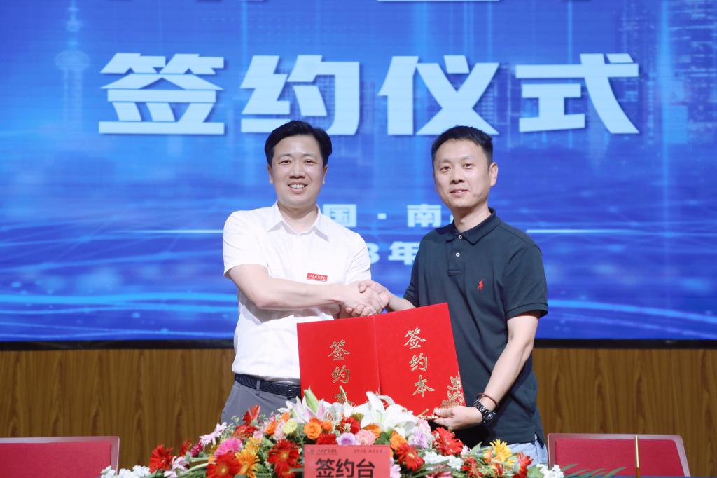 在现场热烈的掌声中,于果董事长、梁涛副总裁、郑昕总经理一同为电商产业学院揭牌。李玮副校长、梁涛副总裁分别代表校企双方进行签约。