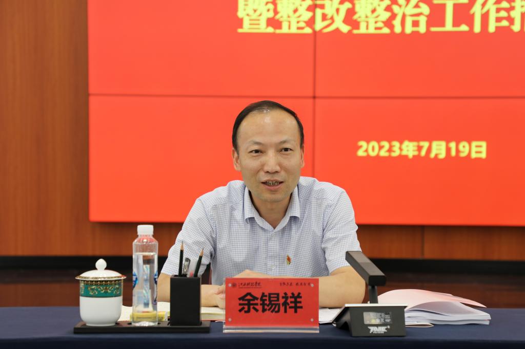 余锡祥在指导讲话中对学校在主题教育调查研究与成果转化方面,以及整改整治工作取得的成效给予充分肯定。他指出,此次会议既是一次成果交流会,也是一次整改整治工作推进会。会议严格对标对表中央,对照省委主题教育办的部署要求,学校党委高度重视,组织准备充分,达到了预期效果。学校党政班子成员领题调研聚焦主责主业,求真务实围绕学校发展的难点痛点、堵点瘀点,以高度的担当精神发现问题,提出解决问题的思路和举措,形成有质量的调研报告,为学校高质量发展打下坚实的基础。他表示,一直以来,省委教育工委、省教育厅高度重视江西科技学院的建设发展。主题教育启动以来,省教育工委书记、省教育厅厅长吴永明亲自挂点联系指导江科开展好主题教育,多次作出指示,要求江科通过主题教育进一步推动学校高质量发展,进一步落实以生为本、以师为尊的办学理念。对学校主题教育下一步工作,特别是整改整治工作,他提出四点意见。一是强化理论武装,提高政治站位,夯实主题教育思想根基。学思想是这次主题教育的第一位政治任务,是贯穿始终的主线,要一以贯之接受思想洗礼、一刻不停开展理论学习。二是突出知行合一,注重工作实效,抓好调研成果转化运用。要持续破解难题,要抓好建章立制,要在常态长效上下功夫。三是坚持问题导向,敢于动真碰硬,推动整改整治落地见效。要开展问题清单回头看,要加强追踪问效,要办好民生实事。四是压紧压实责任,形成工作闭环,推进主题教育走深走实。学校党委要进一步凝聚工作合力,与董事会、行政形成三驾马车共同发力,让调研成果转化、整改整治工作落地见效。