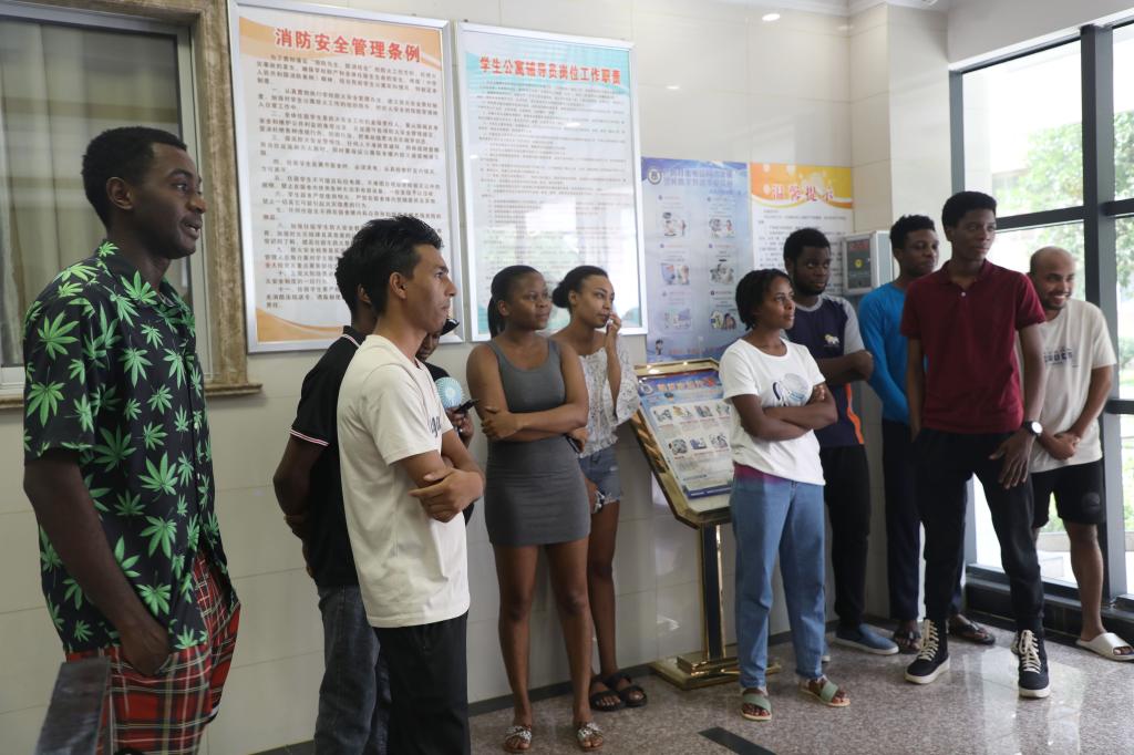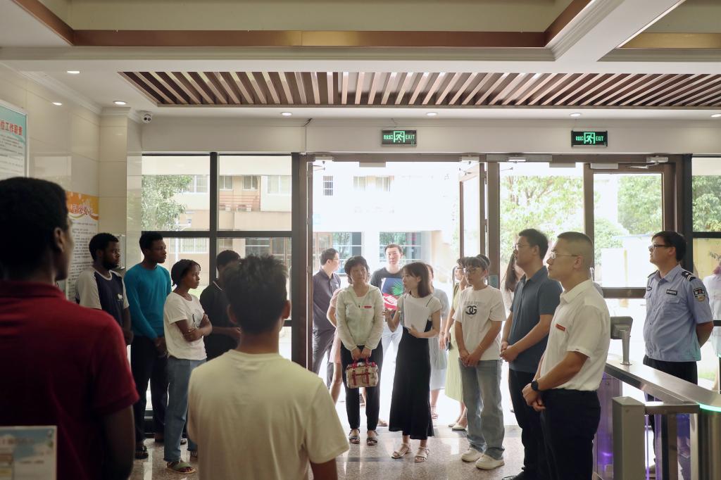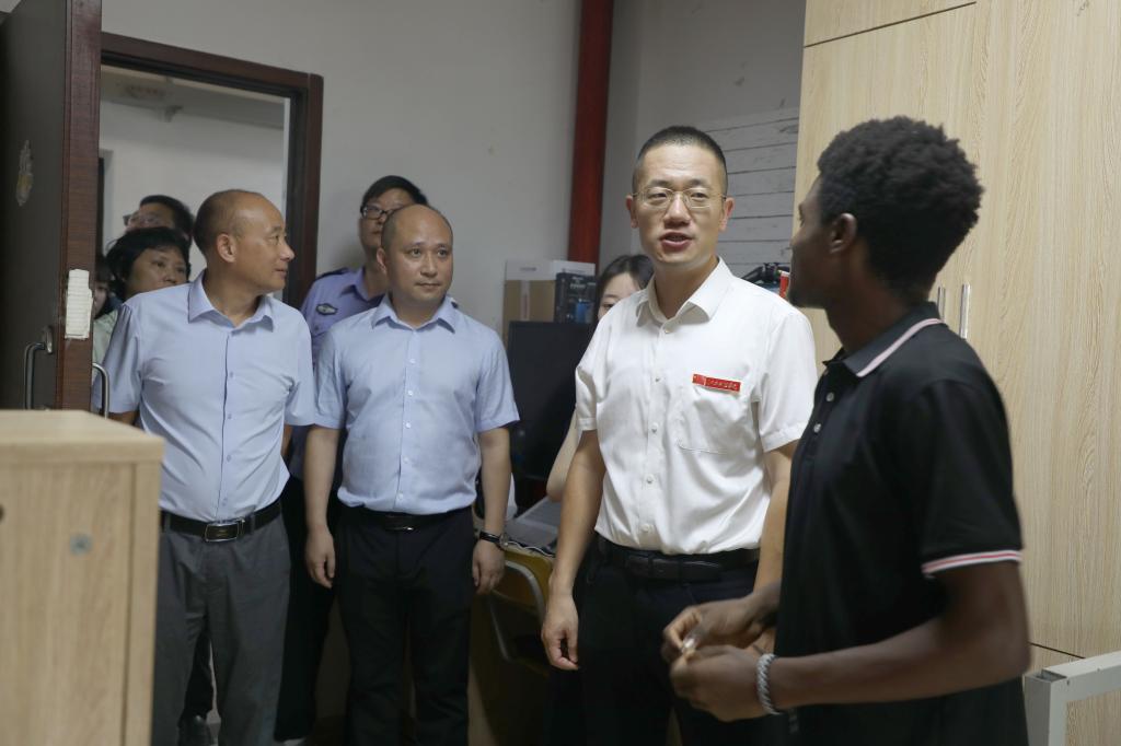 学工处处长鲁斌、保卫处处长谢秋明在走访中叮嘱留学生要做好防暑工作,外出时注意交通安全和自身财物安全。