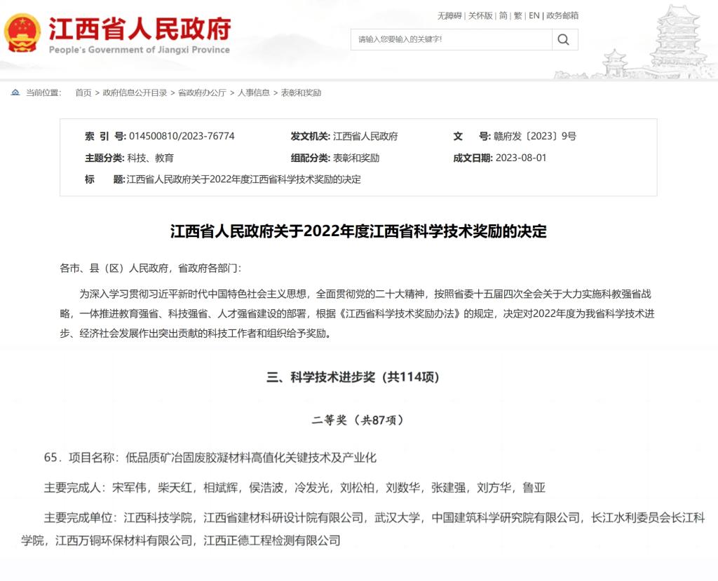 江科网讯(通讯员 李先启 记者 何强江)近日,江西省人民政府公布了《关于2022年度江西省科学技术奖励的决定》(赣府发〔2023〕9号),我校宋军伟教授领衔的项目“低品质矿冶固废胶凝材料高值化关键技术及产业化”,夺得省科学技术进步奖二等奖。