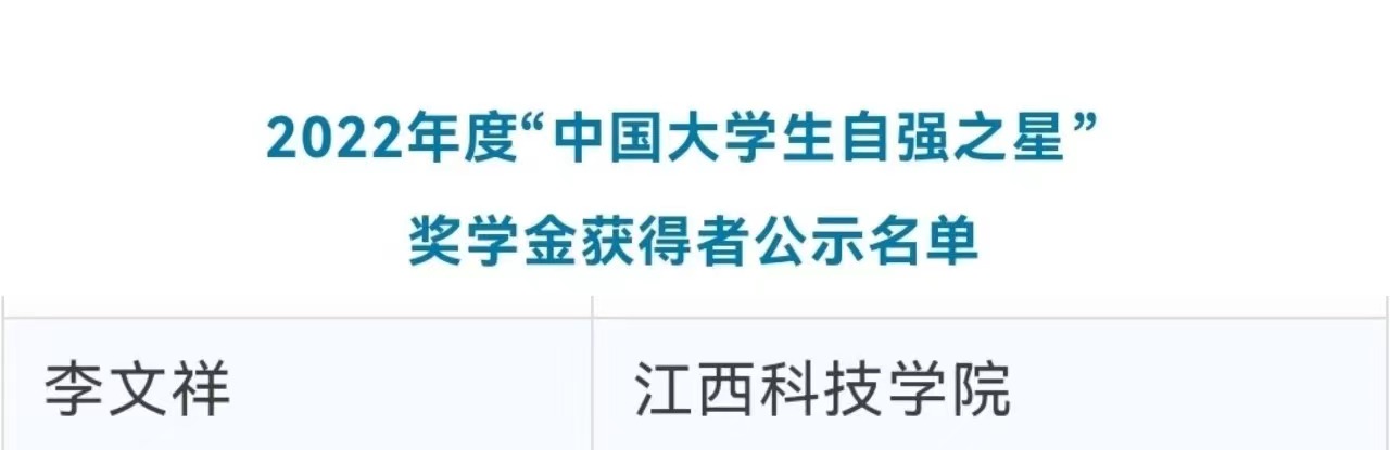 江科网讯(通讯员 彭昭旭)近日,由共青团中央、全国学联指导,中国青年报社、新东方教育科技集团、中国青年创业就业基金会联合举办的2022年度“中国大学生自强之星”奖学金推报活动评选结果揭晓。经高校推荐、省级初评、专家评审等环节,我校财经学院21本会计2班李文祥荣获2022年度“中国大学生自强之星”奖学金。