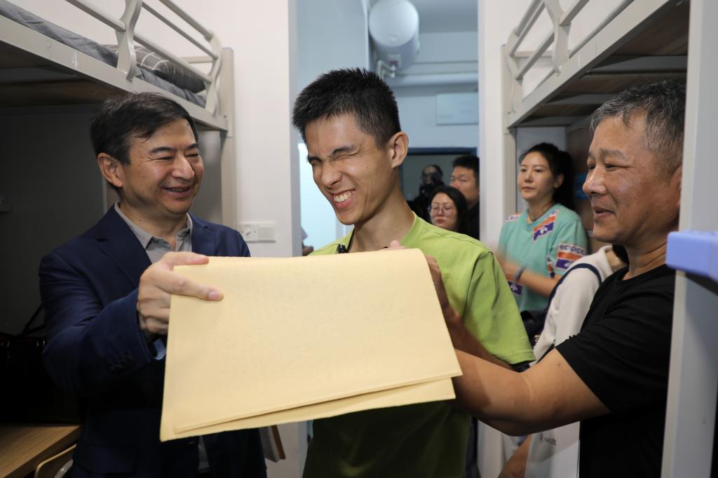 为了迎接这位特殊的同学,学校提前制定了详细、暖心的工作方案。报到当天,黄镇宇的室友和老师手持鲜花和欢迎牌早早等在南昌站迎接他的到来。“黄镇宇同学,欢迎你!”13时45分,一下车的黄镇宇便感受到室友和老师的热情。乘坐学校准备的接站车到达新生报到服务点后,黄镇宇接受学校本科四年全额学费资助,并通过“绿色通道”快速完成入学报到。