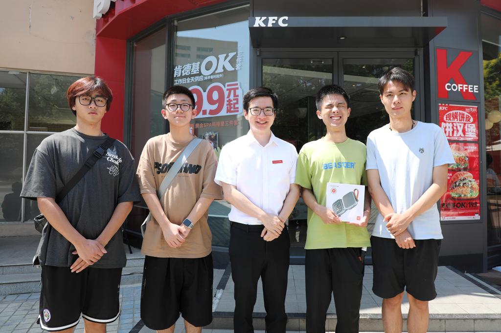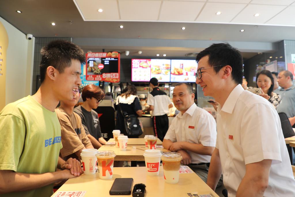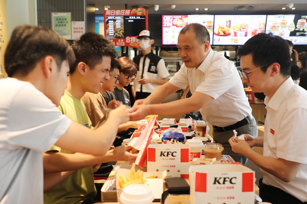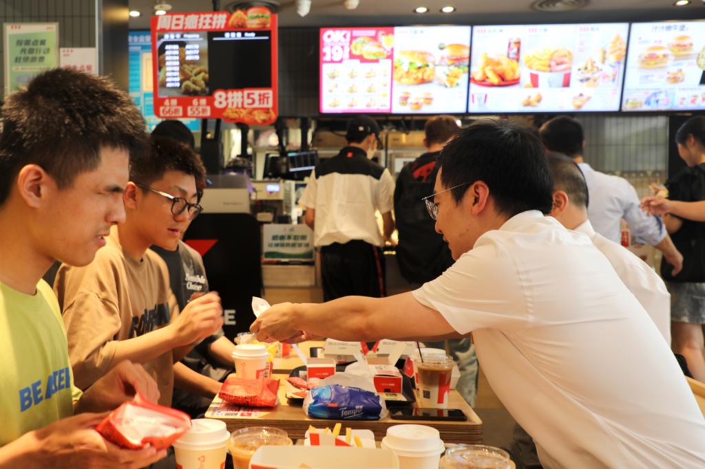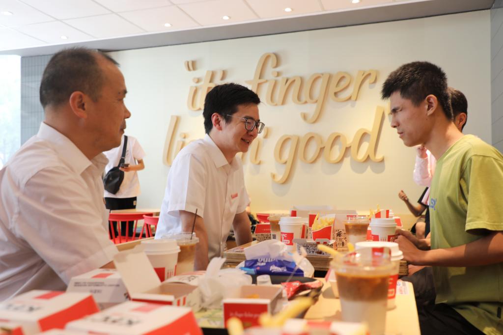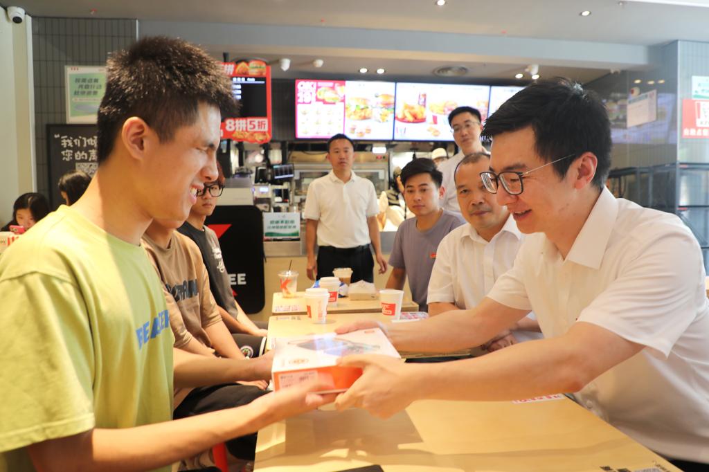 一边吃着炸鸡、薯条,一边喝着可乐、咖啡,现场充满欢声笑语,其乐融融。“镇宇,你多吃点,争取吃胖一点。”说着,喻恺董事长便给黄镇宇同学递上汉堡和蛋挞。他还现场点赞黄镇宇同学的三位室友,对他们主动自愿帮助黄镇宇同学的行为表示肯定,“通过眼神,我看到室友们对镇宇都是非常关爱的,想要照顾我们的镇宇。其实我觉得每个人都是有帮助他人的向善之心,但有时候需要一些榜样去把它激发出来,也需要有这样的一个机会去学习。希望三位室友能够继续坚持初心,与镇宇一同成长、共同进步。”其间,辅导员李猛表示,会把镇宇当做自己的弟弟一样照顾,在未来的四年时间里和镇宇的三位室友共同帮助他解决学习、生活中的困难,让他好好学习、好好成才。