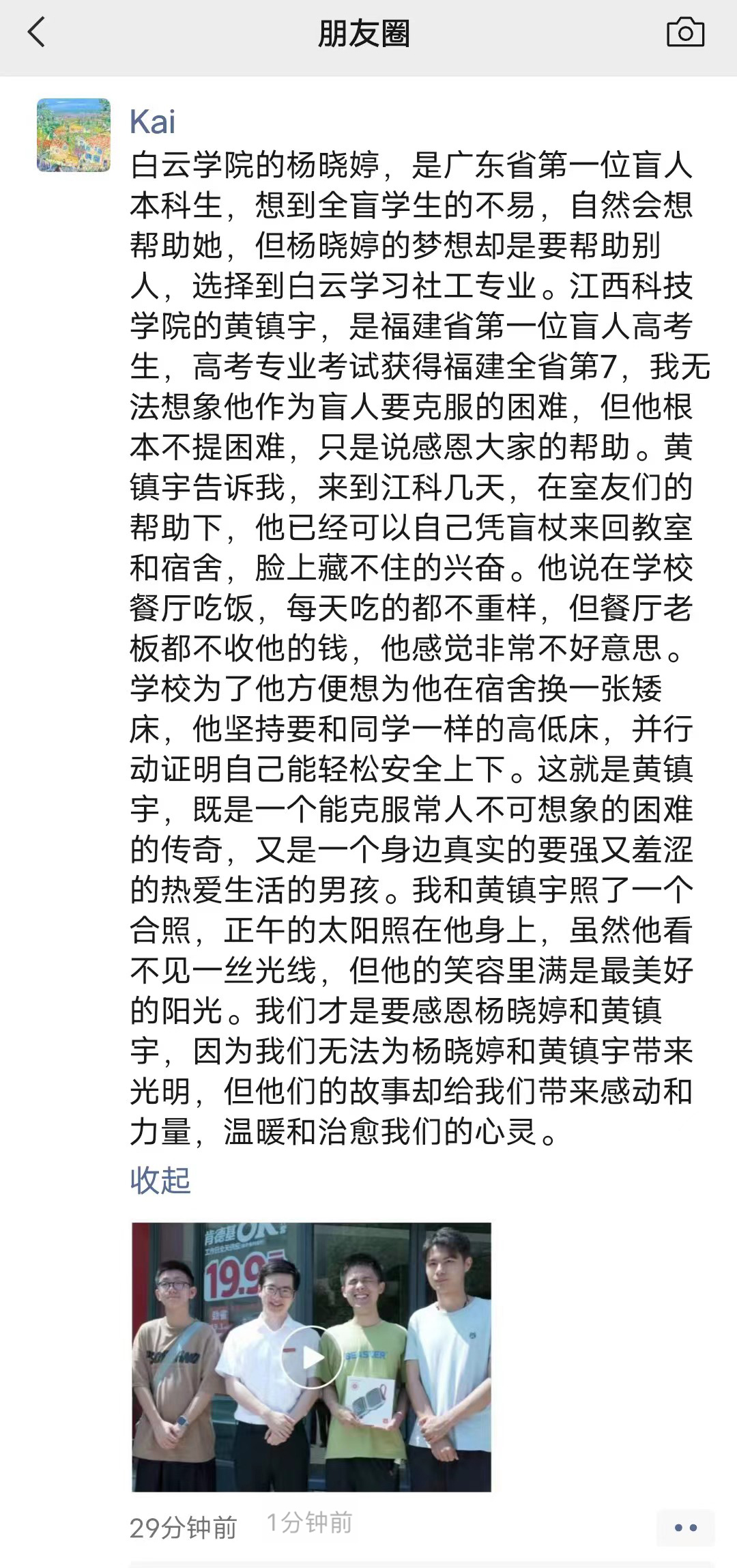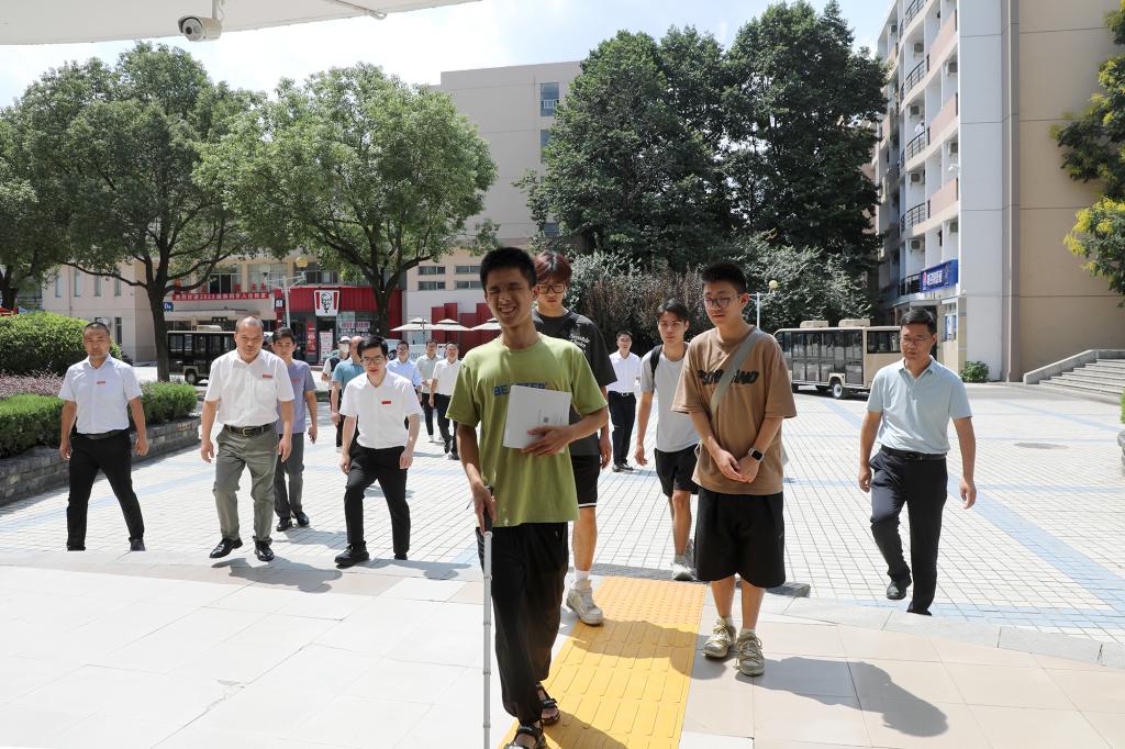 从黄镇宇同学的宿舍出来,喻恺董事长感触很深:“白云学院的杨晓婷,是广东省第一位盲人本科生,想到全盲学生的不易,自然会想帮助她,但杨晓婷的梦想却是要帮助别人,选择到白云学习社工专业。江西科技学院的黄镇宇,是福建省第一位盲人高考生,高考专业考试获得福建全省第7,我无法想象他作为盲人要克服的困难,但他根本不提困难,只是说感恩大家的帮助。黄镇宇告诉我,来到江科几天,在室友们的帮助下,他已经可以自己凭盲杖来回教室和宿舍,脸上藏不住的兴奋。他说在学校餐厅吃饭,每天吃的都不重样,但餐厅老板都不收他的钱,他感觉非常不好意思。学校为了他方便想为他在宿舍换一张矮床,他坚持要和同学一样的高低床,并行动证明自己能轻松安全上下。这就是黄镇宇,既是一个能克服常人不可想象的困难的传奇,又是一个身边真实的要强又羞涩的热爱生活的男孩。我和黄镇宇照了一个合照,正午的太阳照在他身上,虽然他看不见一丝光线,但他的笑容里满是最美好的阳光。我们才是要感恩杨晓婷和黄镇宇,因为我们无法为杨晓婷和黄镇宇带来光明,但他们的故事却给我们带来感动和力量,温暖和治愈我们的心灵。”