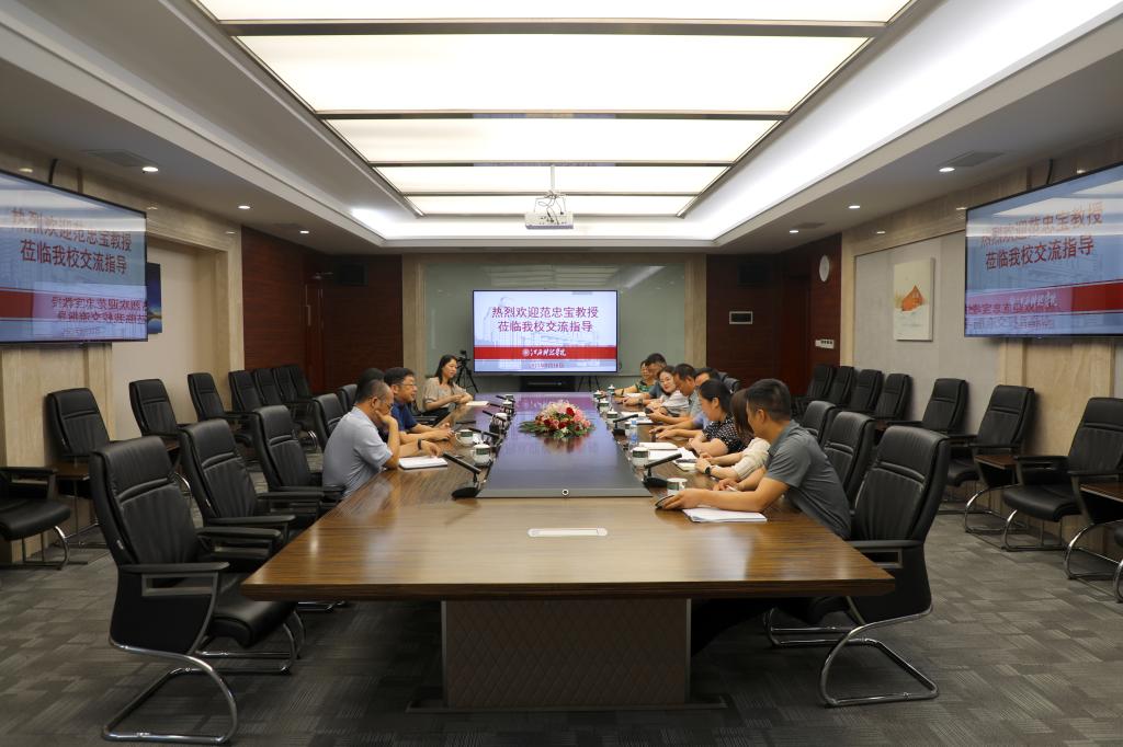 讲座结束后,范忠宝教授与张海涛校长、陈辉副校长及有关部门负责人在行政南楼第三会议室进行座谈交流。
