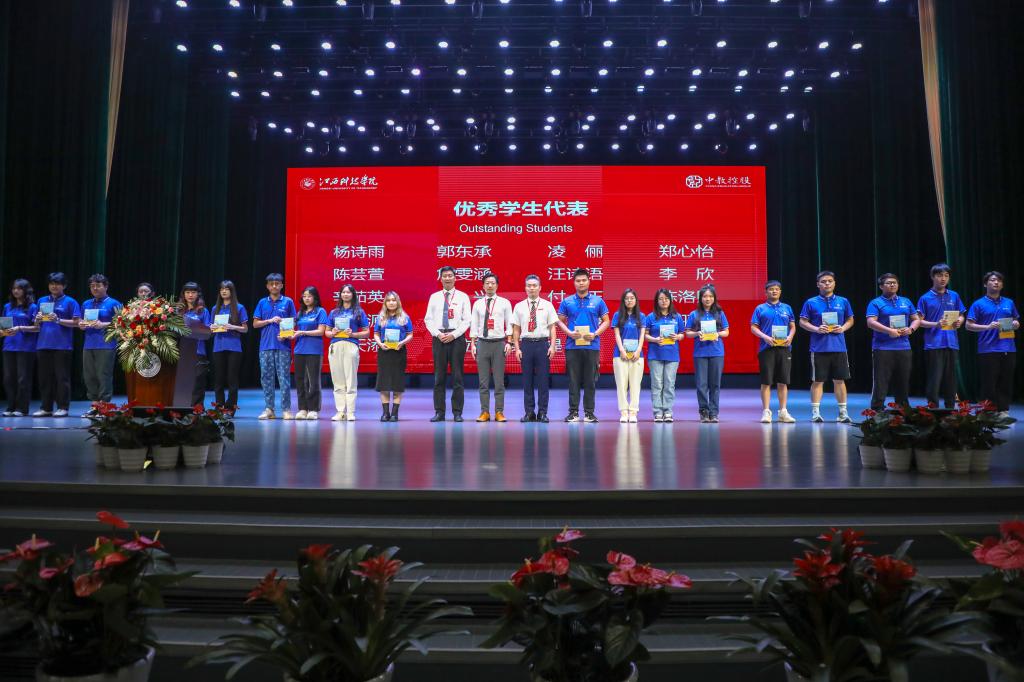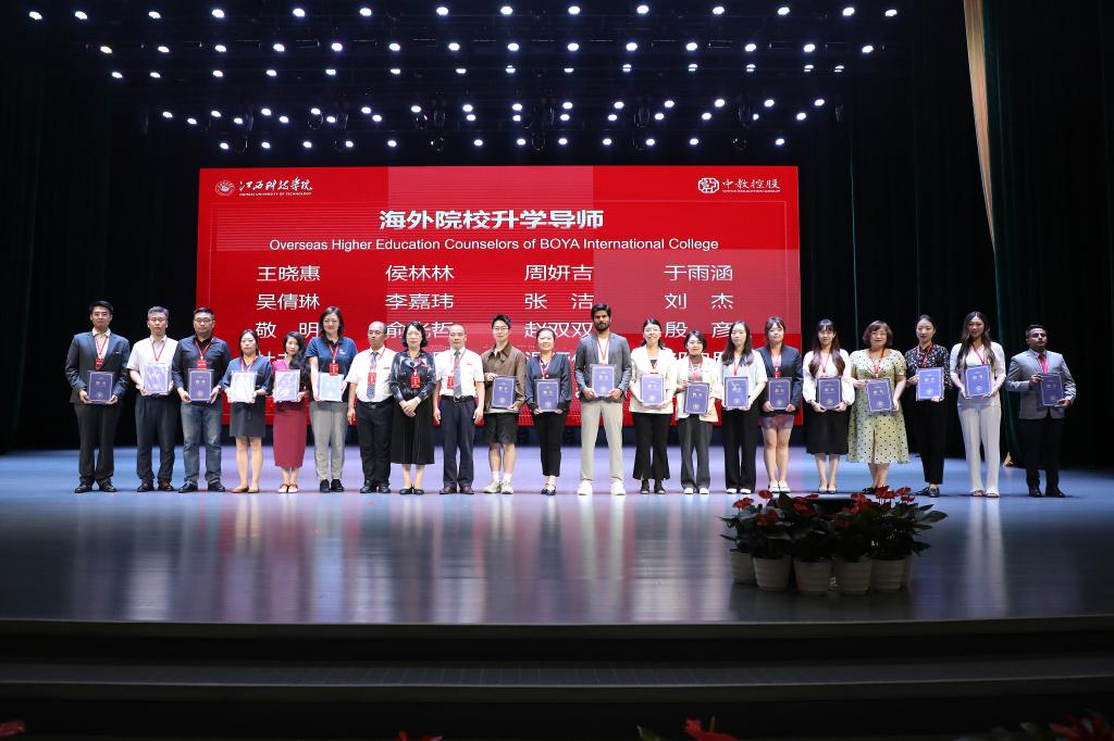 江西科技学院副校长林素君、闵桂林、陈辉为班戈大学、德比大学、赫特福德大学、西伦敦大学、基尔大学、德蒙福特大学、伯明翰大学学院、加拿大百年理工学院、0IEG、韩国梨花女子大学、澳大利亚国王学院、新加坡斯坦福特学院、SG教育集团、Shorelight集团、澳大利亚伍伦贡大学等15位校方代表颁发博雅国际学院海外院校升学导师聘书。江西科技学院副校长李玮、周冰冰,党委副书记夏拥华为博雅国际学院优秀学生代表赠予经典书籍,希望优秀学子们不负学校的关怀和厚望,在新学期里认真读书,争做表率,共同书写美好的未来。