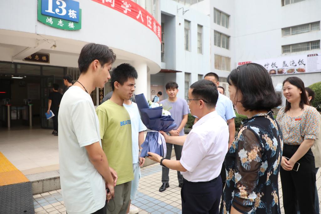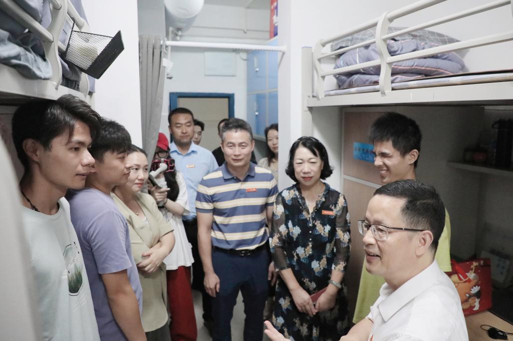 林素君副校长亲切叮嘱黄镇宇同学平时要多吃点,吃胖一点,有一个好的健康的身体,这样才能好好学知识、长本领。周冰冰副校长嘱托学院领导和辅导员要多关心关注黄镇宇同学和室友们的需求,帮助他们更好成长成才。