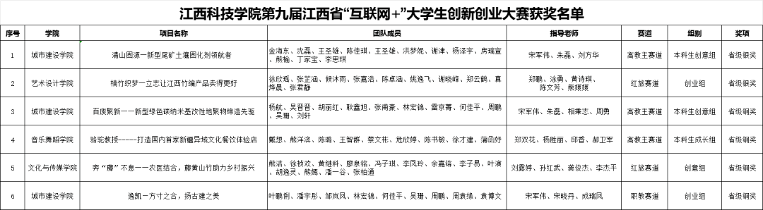 参赛项目《清山固源——新型尾矿土壤固化剂领航者》(指导老师:刘方华、宋军伟、朱磊、秦玉娇、俞慧婷)、《楠竹织梦——立志让江西竹编产品卖得更好》(指导老师:郑鹏、涂勇、陈文芳、黄诗琪、熊媛媛)获省级银奖,《骆驼教授-----打造国内首家新疆异域文化餐饮体验店》(郑双花、杨胜丽、郝卫军、 邱香)、《百废聚新——新型绿色碳纳米基改性地聚物缔造先驱》(指导老师:相秉志、朱磊、周勇、宋军伟、谭捷)、奔“藤”不息——农医结合,藤黄山竹助力乡村振兴(指导老师:龚俊杰、曾浩、刘露婷、李杰平、孙红武)、《逸凯——方寸之合,扬古建之美》(指导老师:宋军伟、宋晓丹、成瑞凤)获省级铜奖。