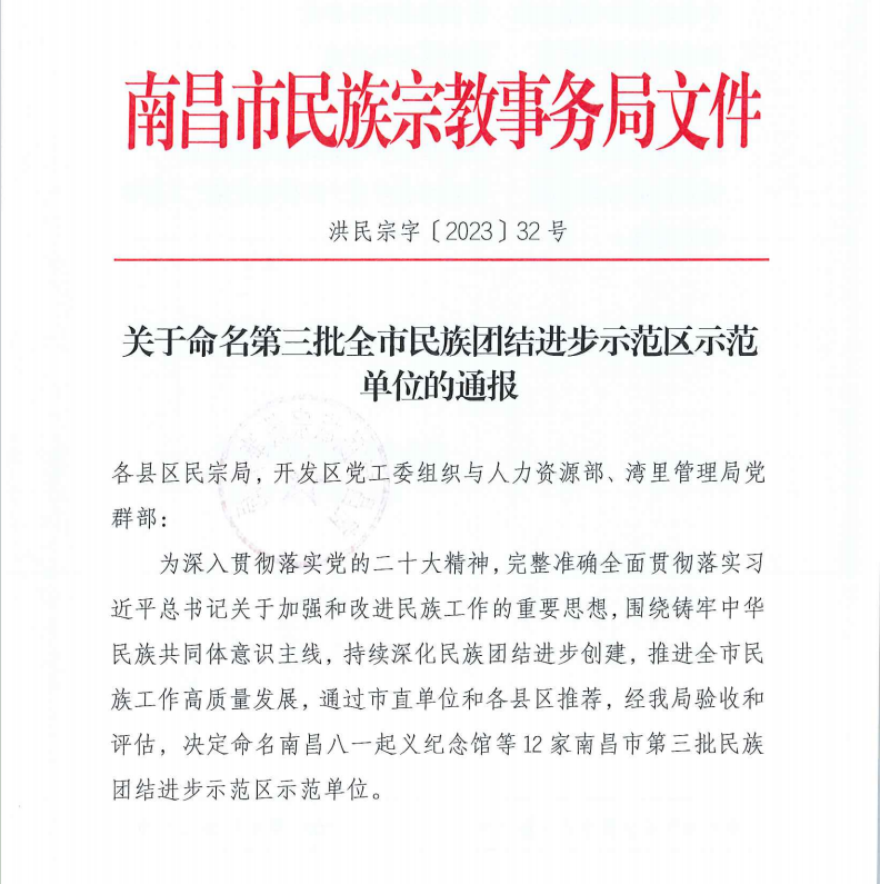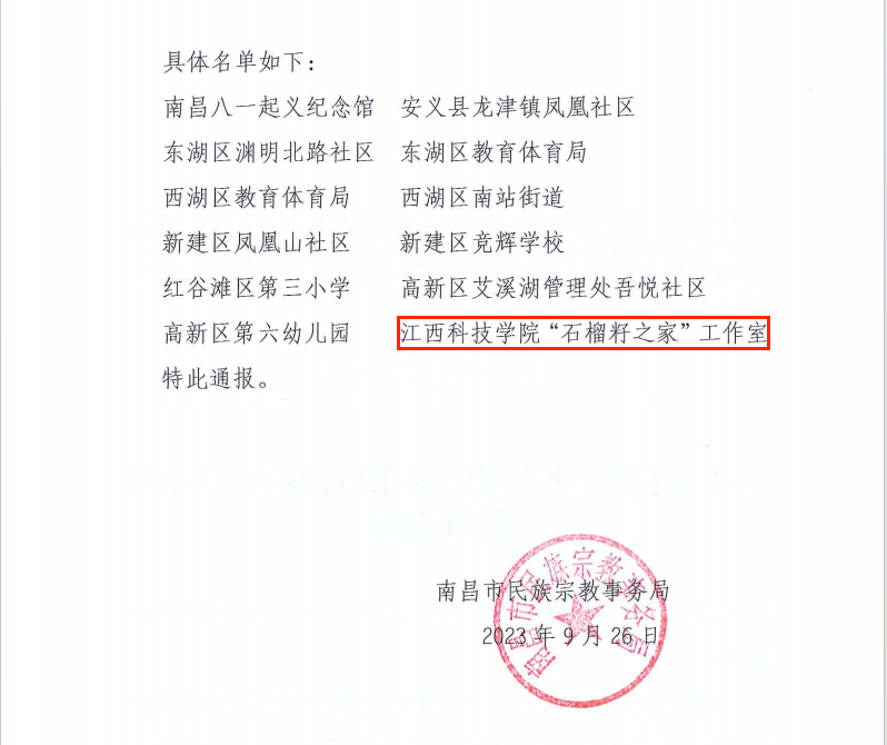 江科网讯(通讯员 王颖)日前,南昌市民族宗教事务局下发《关于命名第三批全市团结进步示范区示范单位的通报》(洪民宗字〔2023〕32号),我校“石榴籽之家”工作室获评第三批全市民族团结进步示范区示范单位。